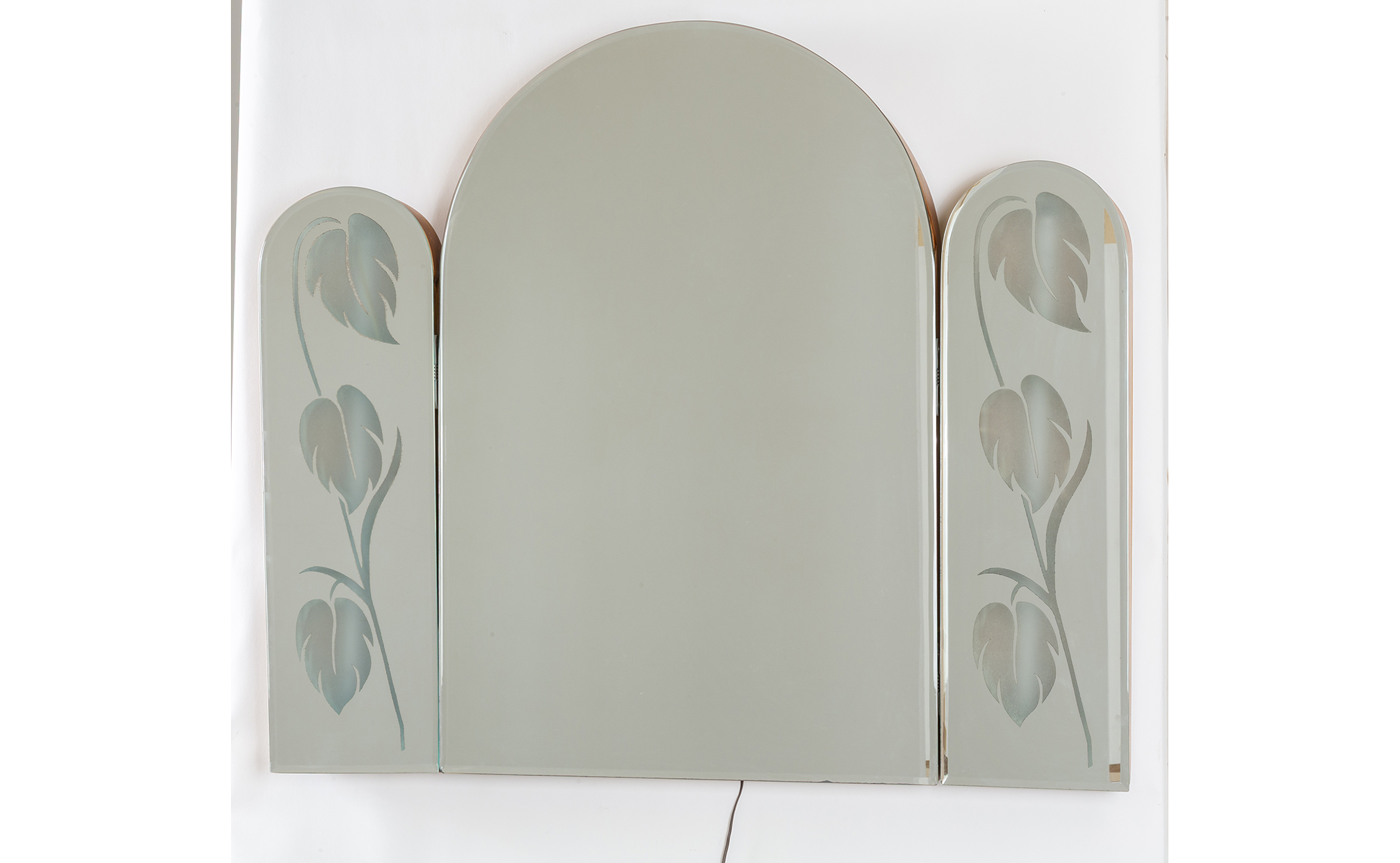 Struttura in compensato cristallo argentato con decori incisi a getto di sabbia.