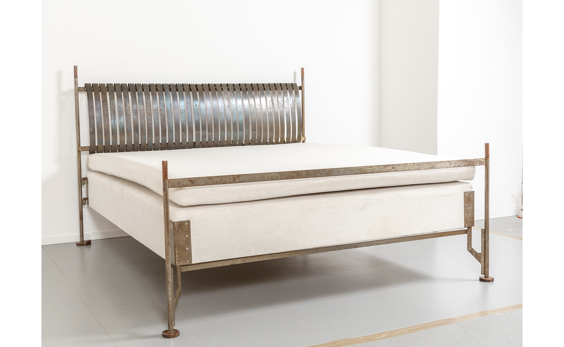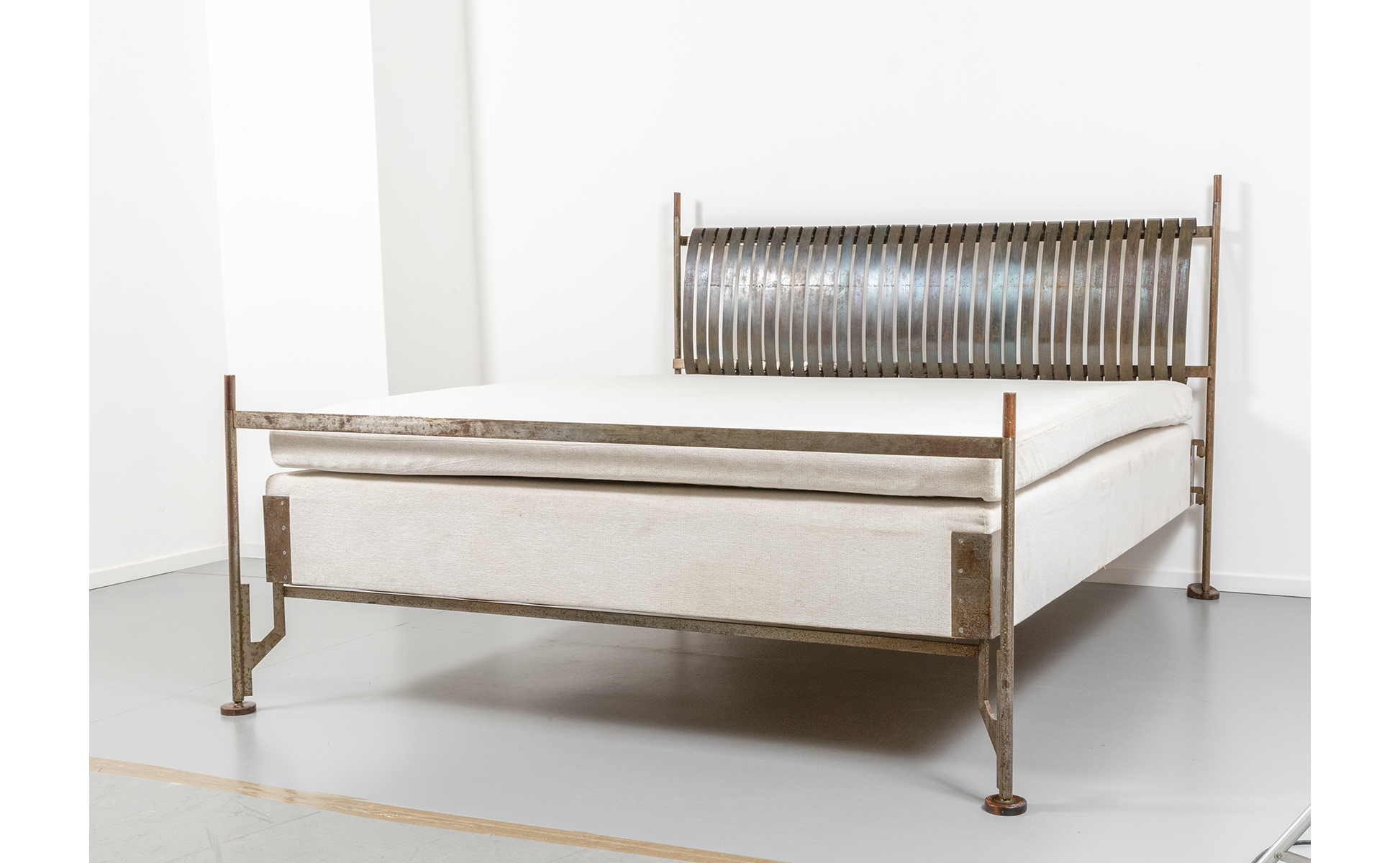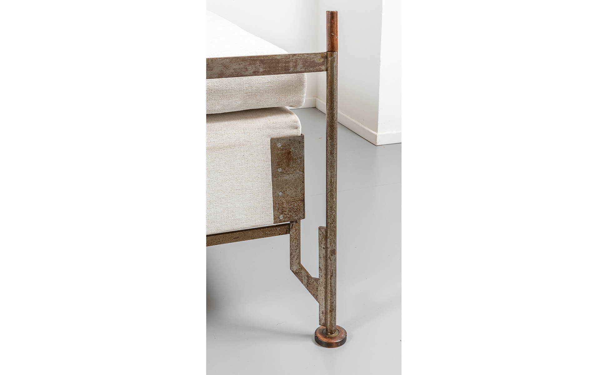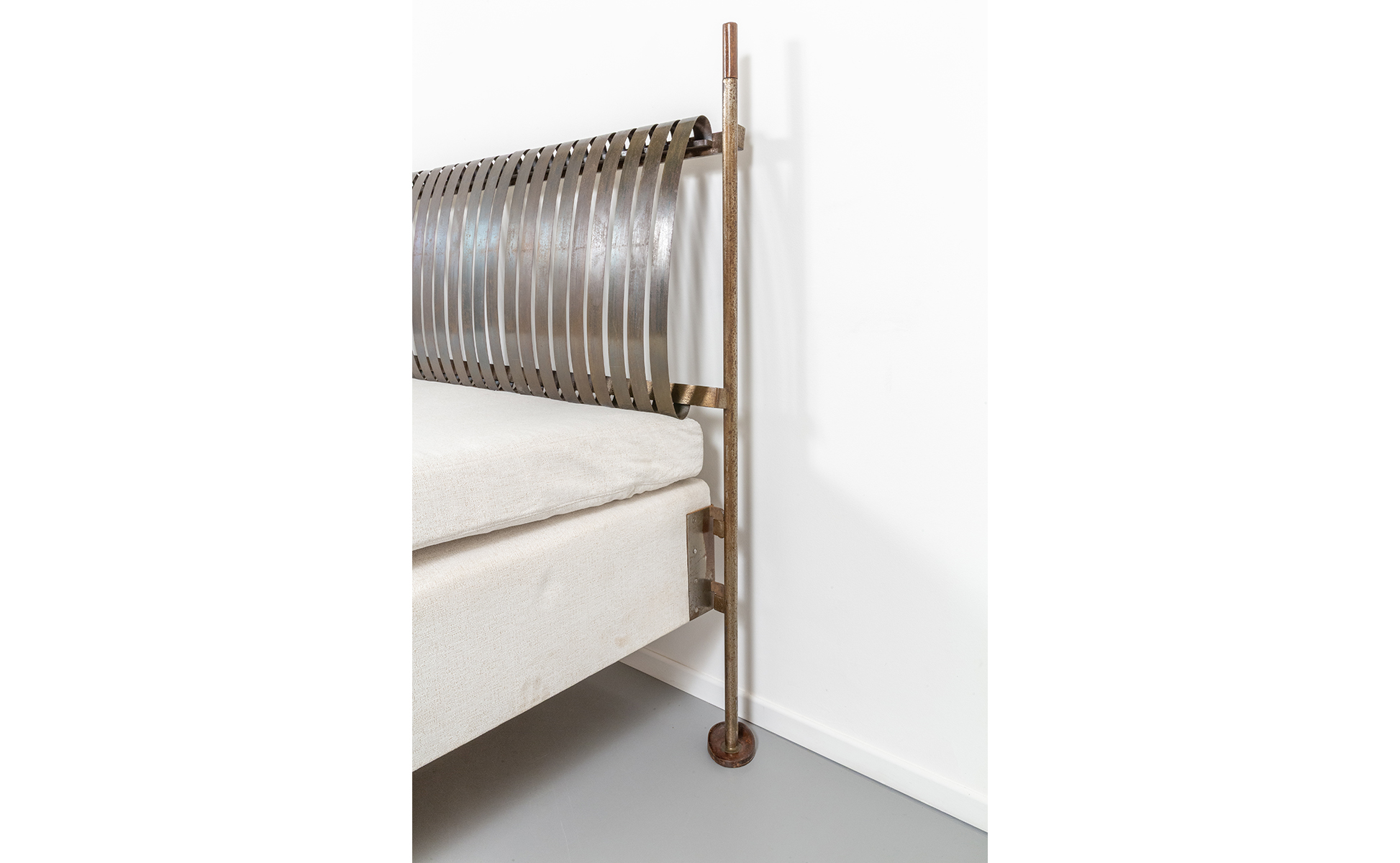 Struttura in acciaio con piedini e puntali in legno testiera con molle di acciaio.
