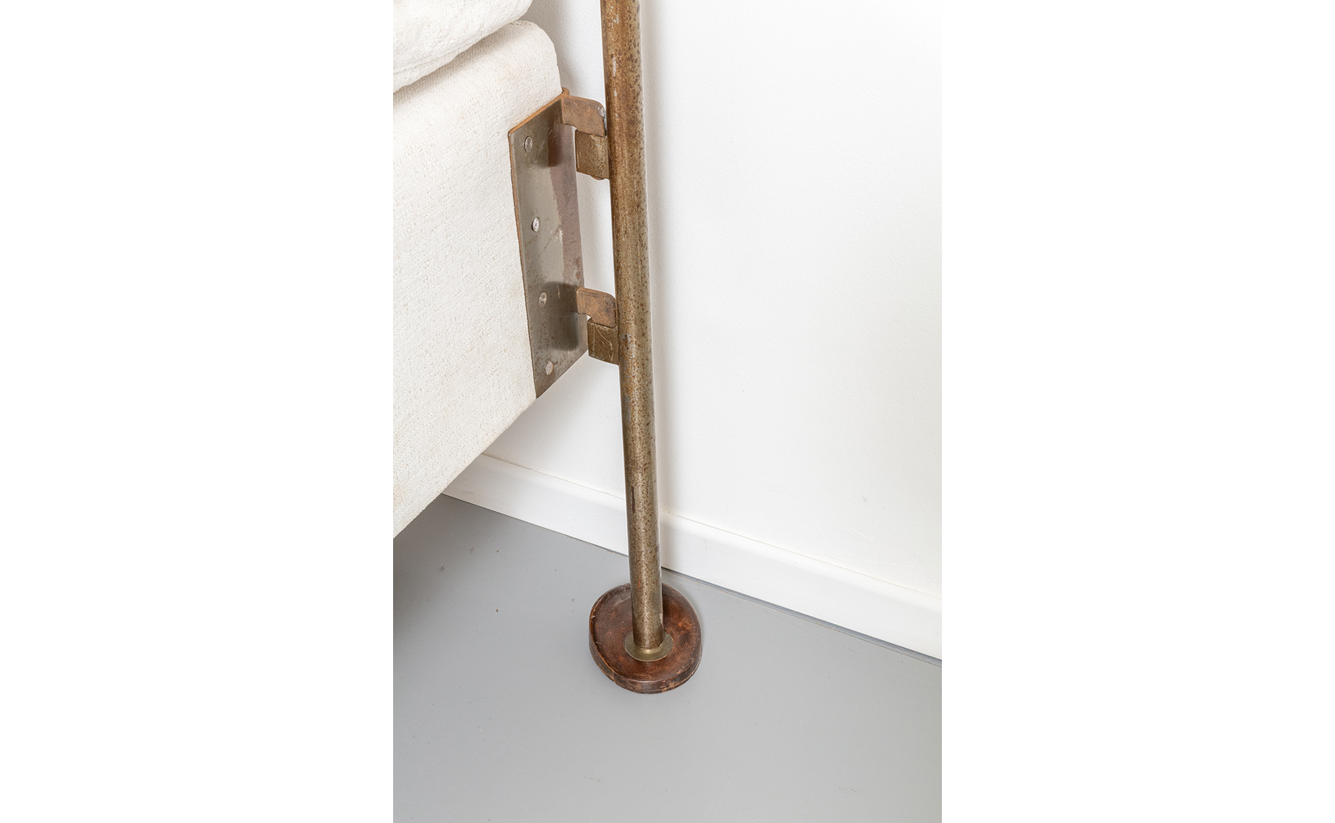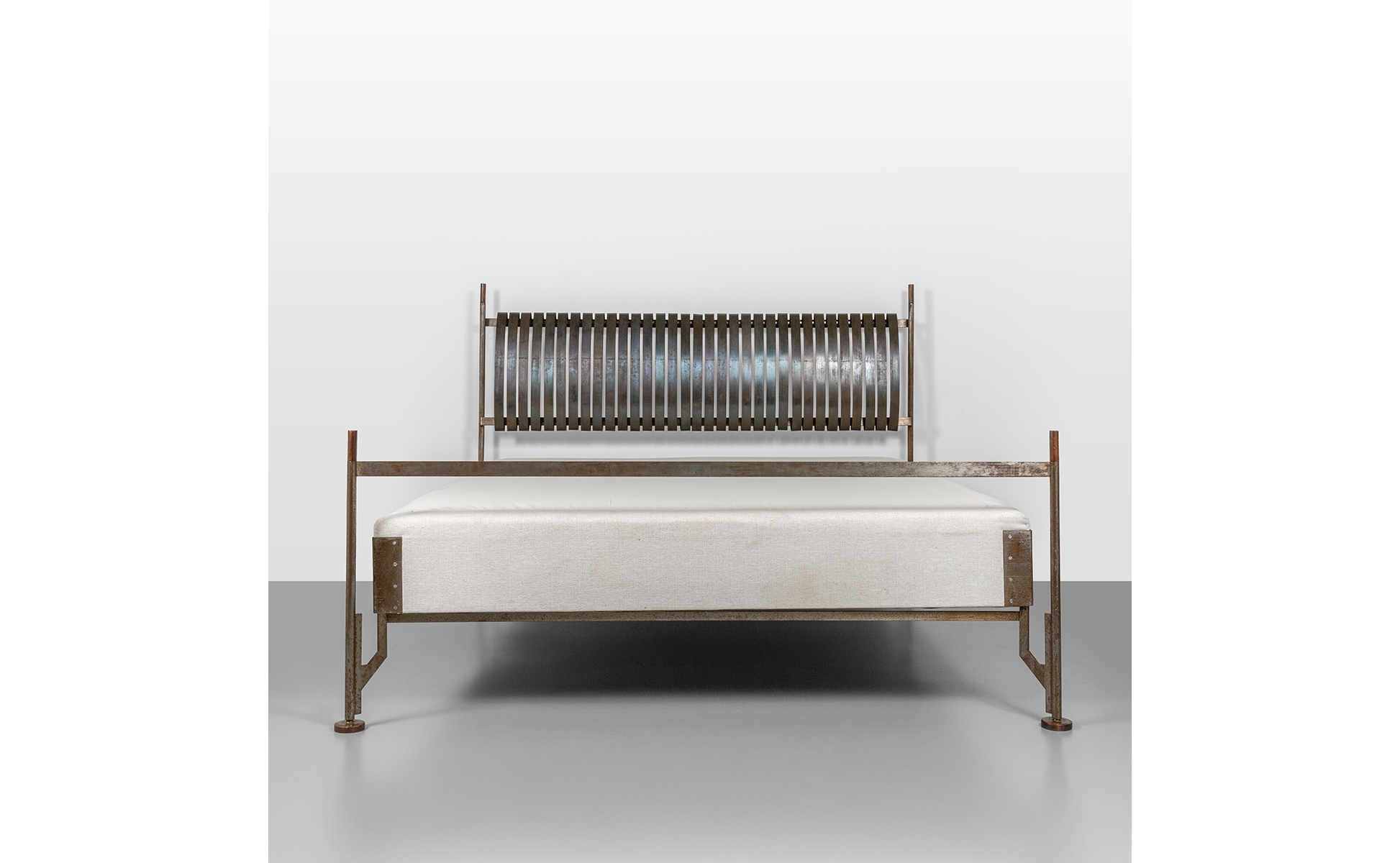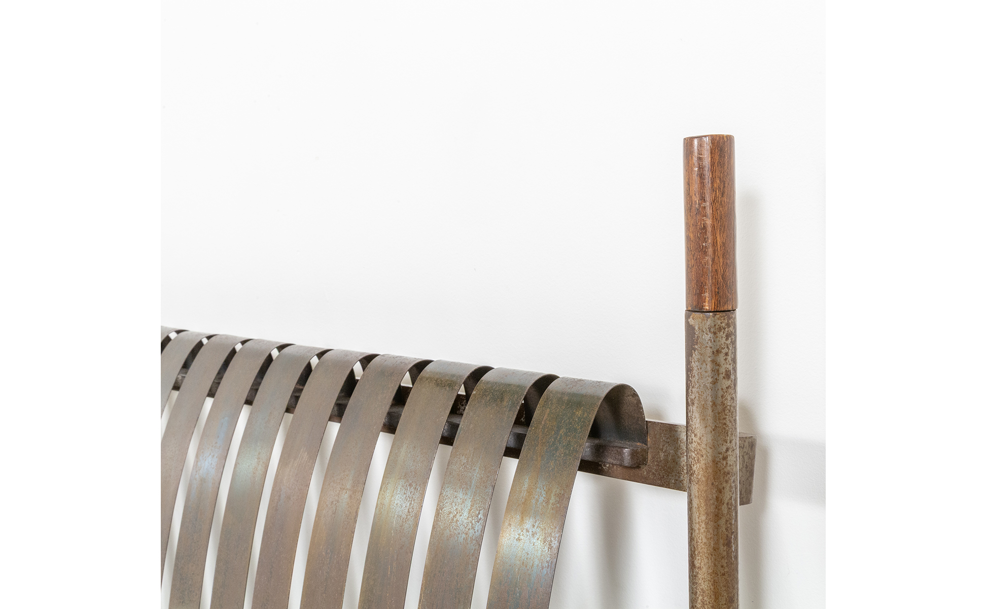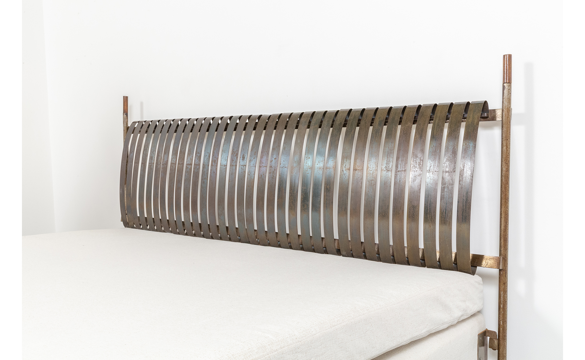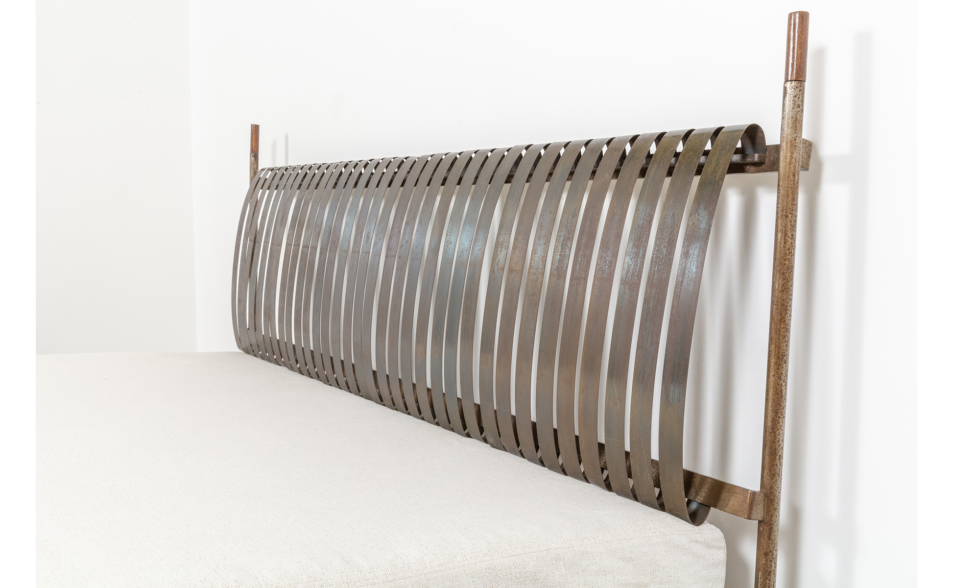 Struttura in acciaio con piedini e puntali in legno testiera con molle di acciaio.