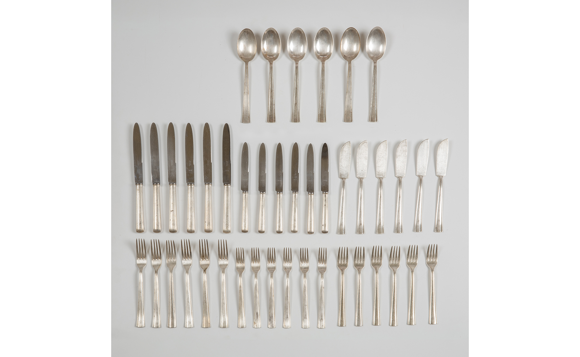 6 table forks 6 dessert forks 6 fish forks 6 large knives 6 knives 6 fish knives 6 spoons.
