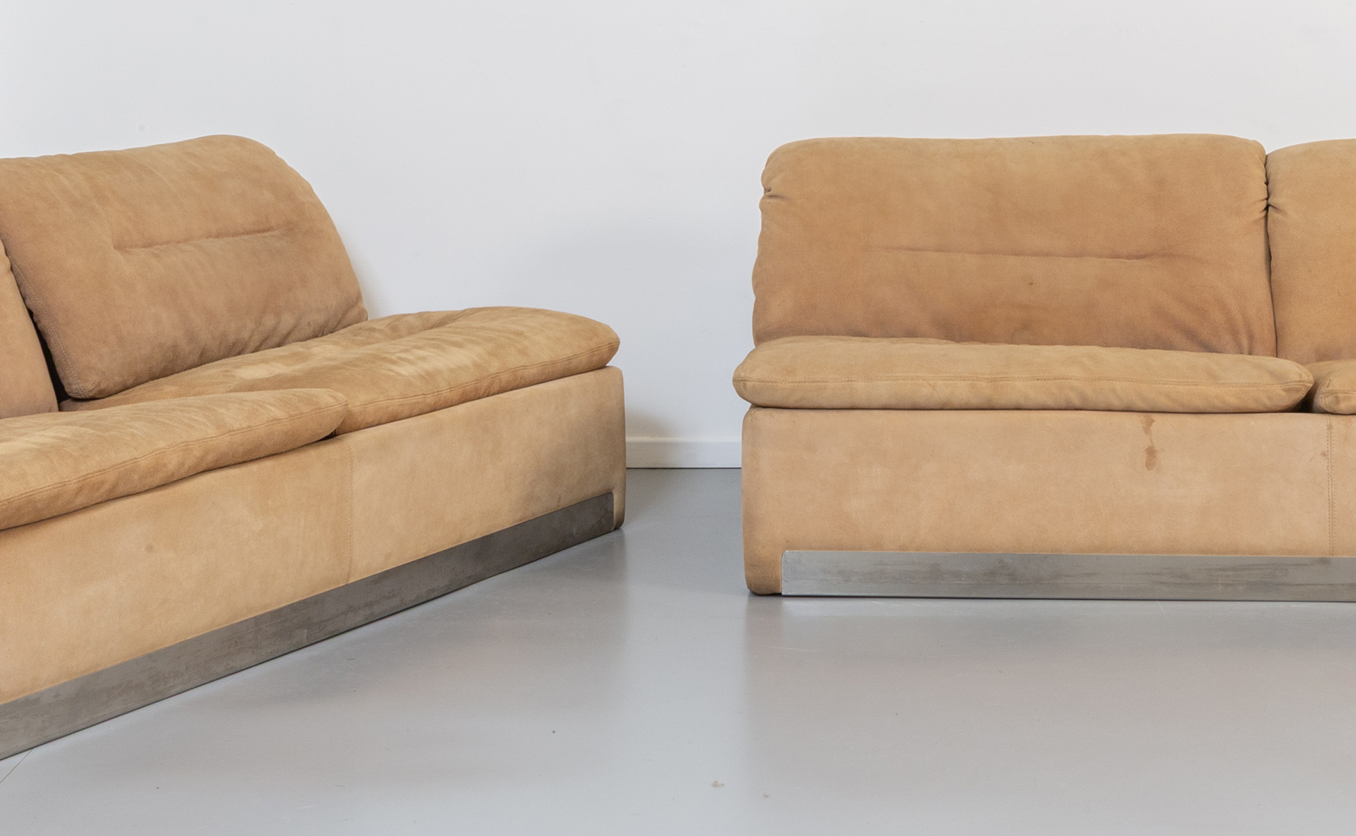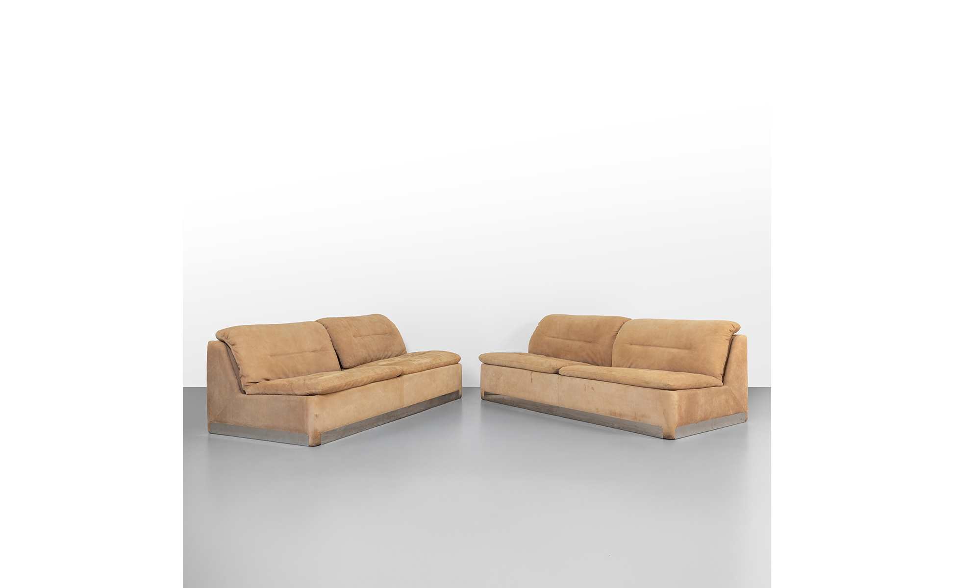 Strutture in legno imbottiture e cuscini rivestiti in pelle scamosciata.