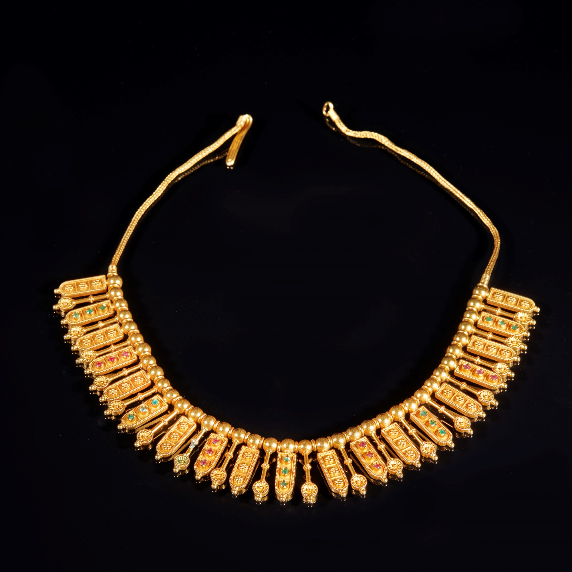 Collana in oro giallo ad alto titolo (superiore a 18K), realizzata come una catena a corda a cui sospesi elementi incisi e decorati con piccoli rubini e smeraldi. Lunghezza 38 cm. Peso complessivo 31,3 grammi.