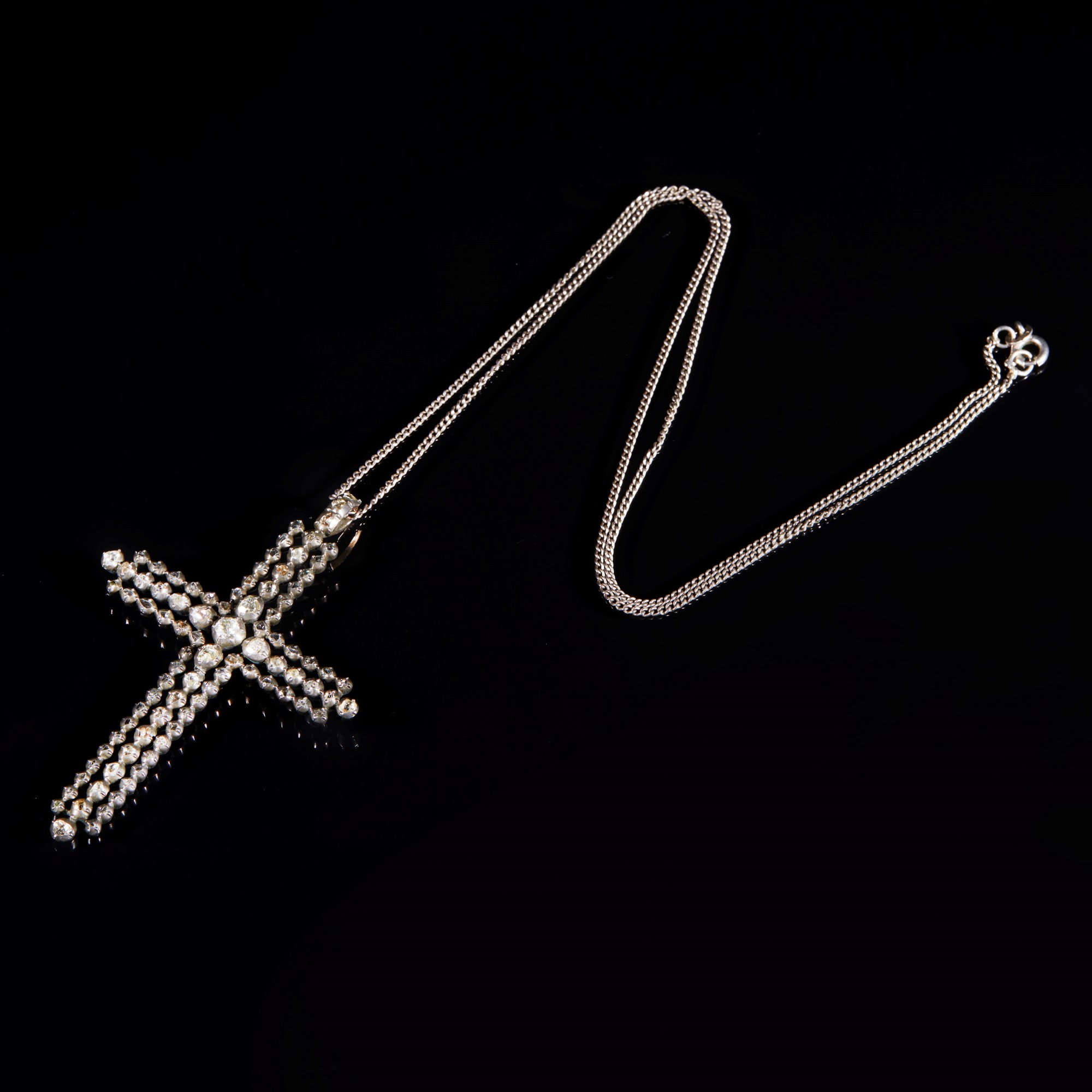 Collana in argento con grande pendente a foggia di croce interamente decorata con diamanti di taglio a rosetta. Peso complessivo 14,6 grammi.