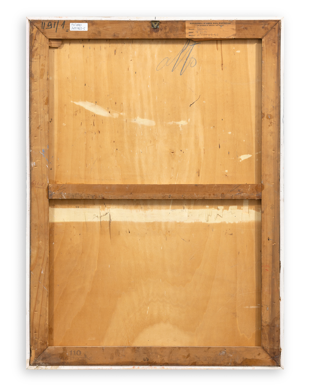 Etichetta della Galleria d'Arte del Naviglio (MI), con caratteristiche tecniche dell'opera, al retro