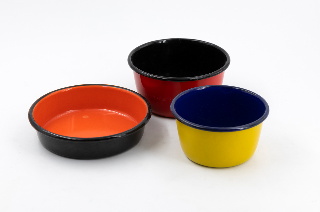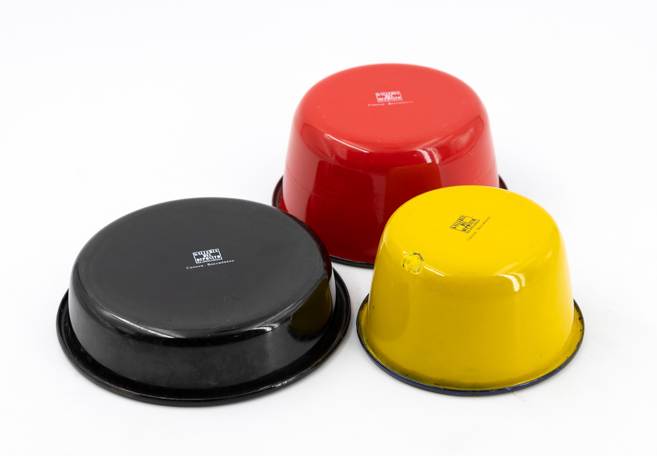 Lotto unico di 3 ciotole in metallo, ciascuna recante iscrizione serigrafata 'Galleria Del Deposito - Genova - Boccadasse' sotto la base