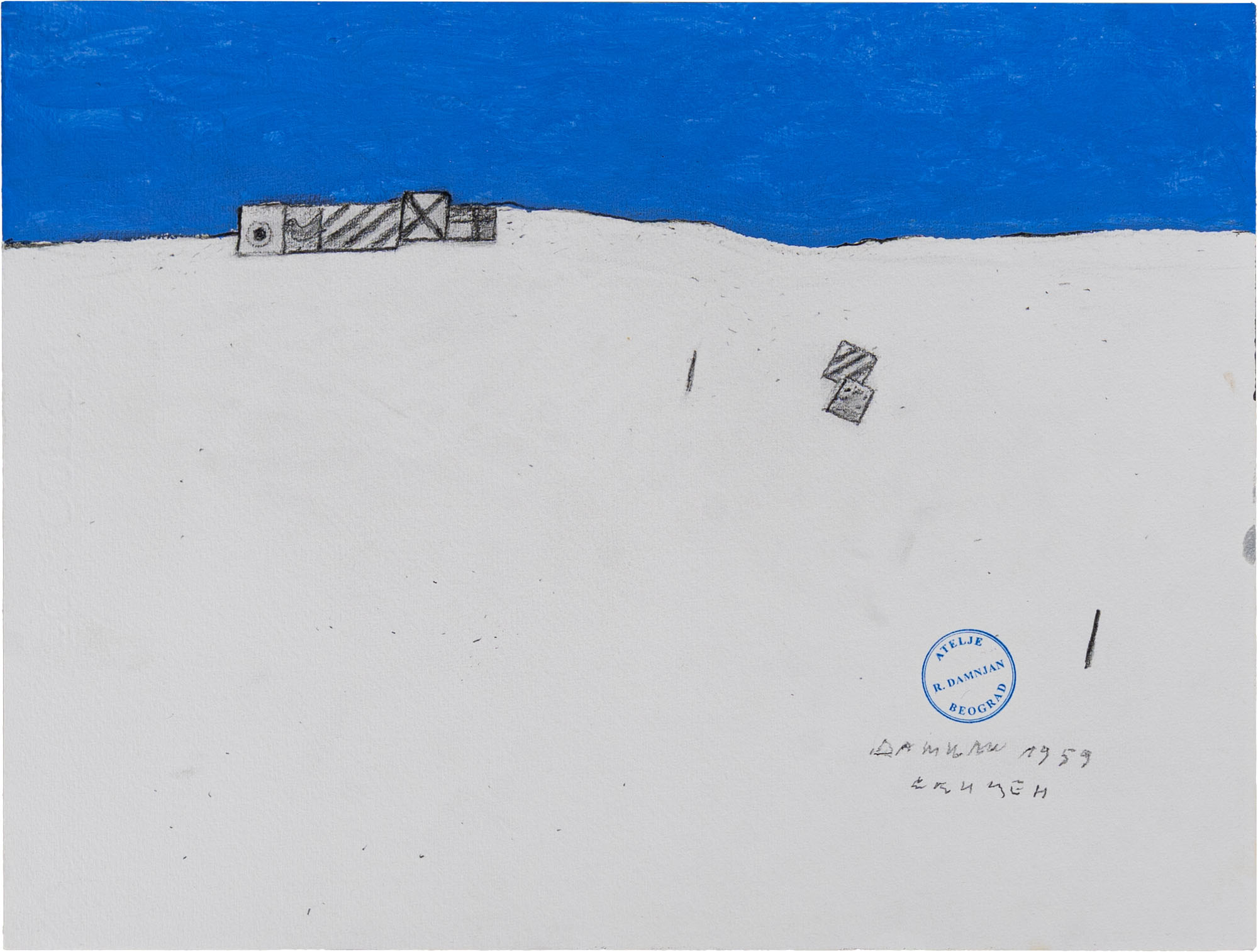 RADOMIR DAMNJANOVIC DAMNJAN(1935 - 2025)Spiaggia1959Matita e tempera su carta30 x 39 cmFirmata e datata in basso a destraTimbro dell'artista in basso a destraL'autenticità dell'opera è stata confermata dalla moglie dell'artista e futura presidente del costituendo archivioPROVENIENZA:Collezione privata, Milano