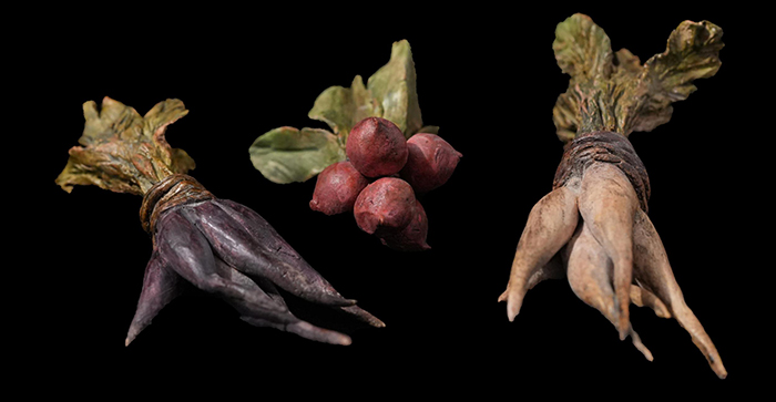 Lotto composto da: carote, cm 9 carote viola, cm 8 ravanelli cm 5,5 in terracotta policroma Napoli XVIII - XIX secolo