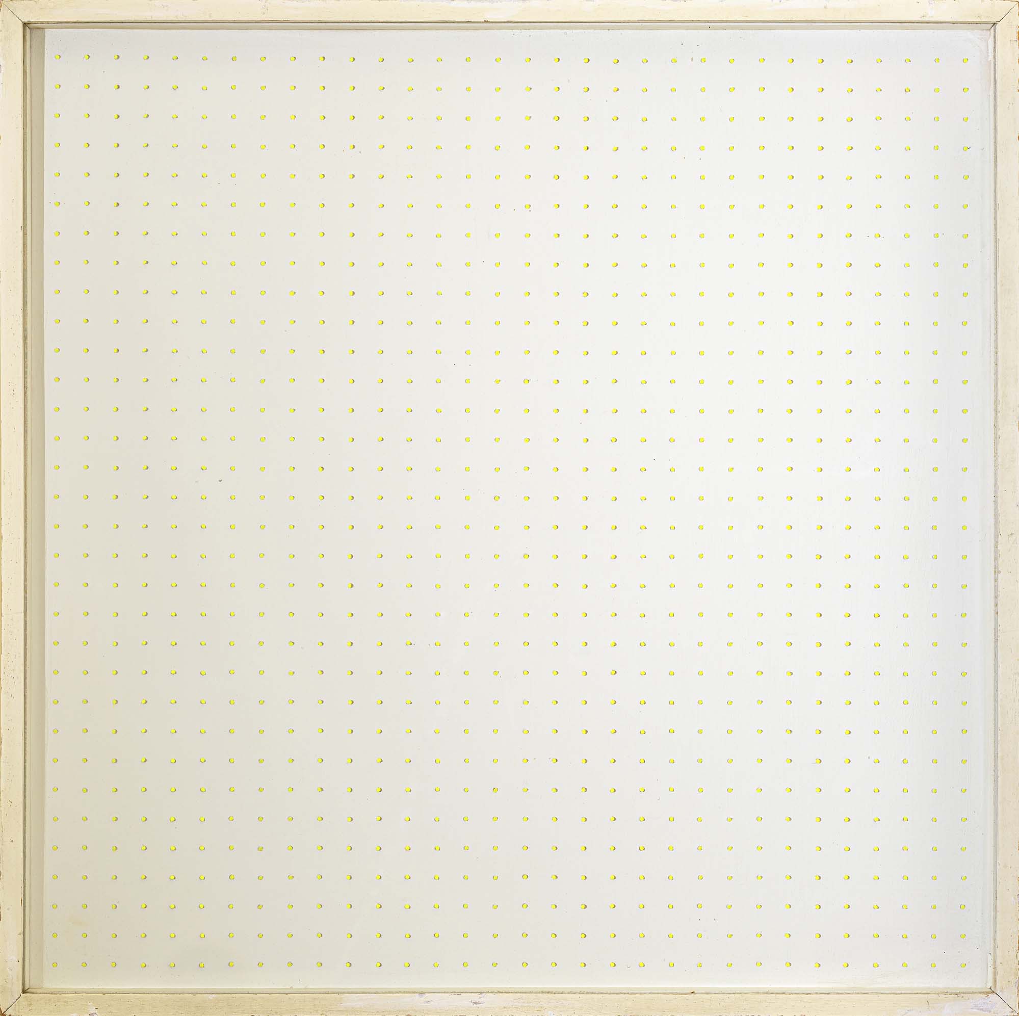 tecnica mista su tavola (tela, bianco giallo fluorescente) cm. 50x50