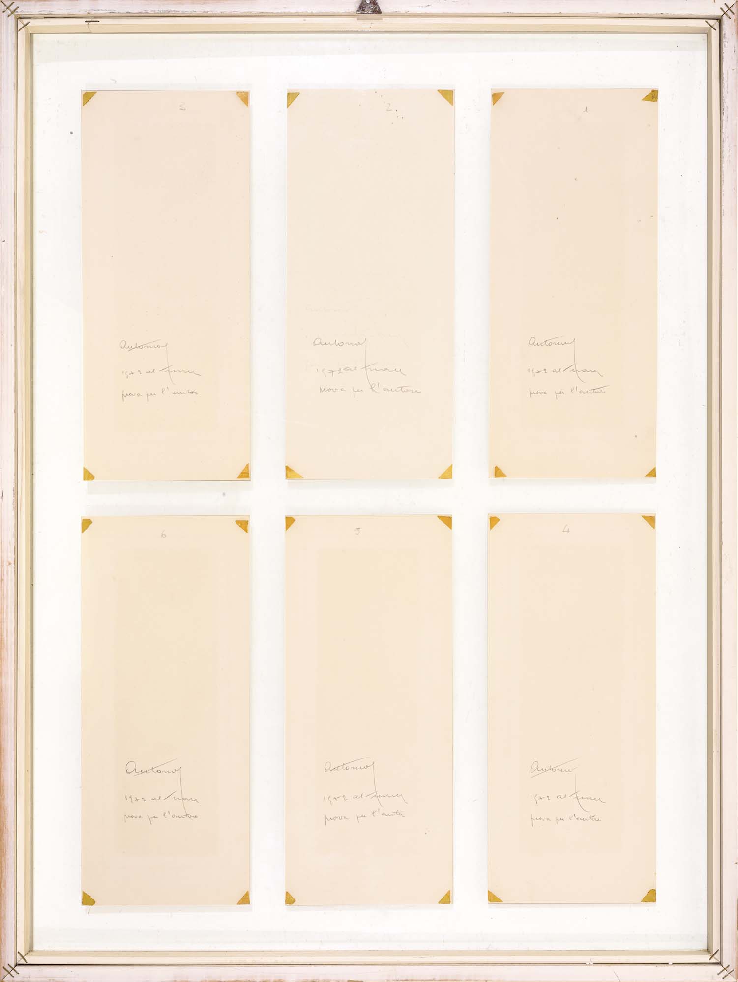 composizione di 6 acquerelli su cartoncino entro unica cornice cm. 85,5x64 -cm. 34,5x15 cad.