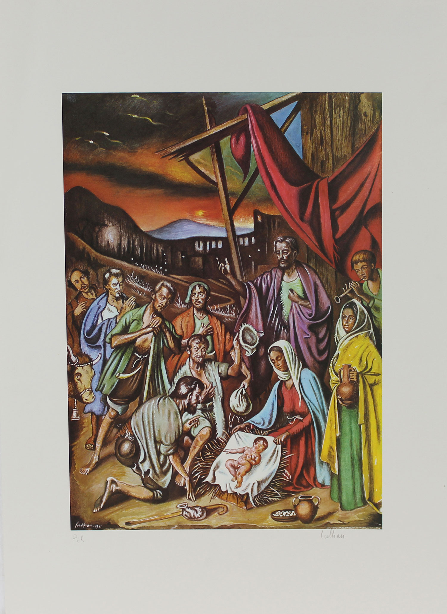 Sciltian Gregorio Natività litografia su carta Fabriano, cm. 70x50, es. P.A. firmata in basso a destra, firmata e datata in lastra in basso a sinistra, certificato di autenticità e garanzia dell'Istituto Poligrafico d'Arte Italiano di Roma senza cornice
