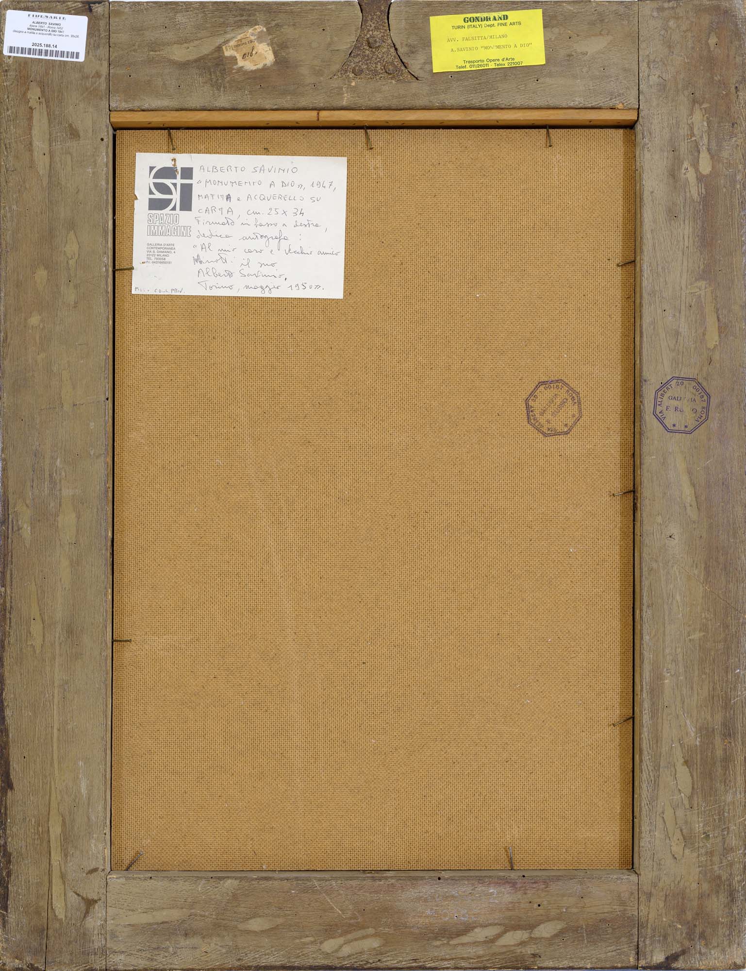 Milano, Galleria Spazio Immagine "Savinio opere su carta 1935-1949" dicembre 1992/febbraio 1993 con relativa pubblicazione sul catalogo - etichetta al retro