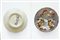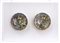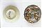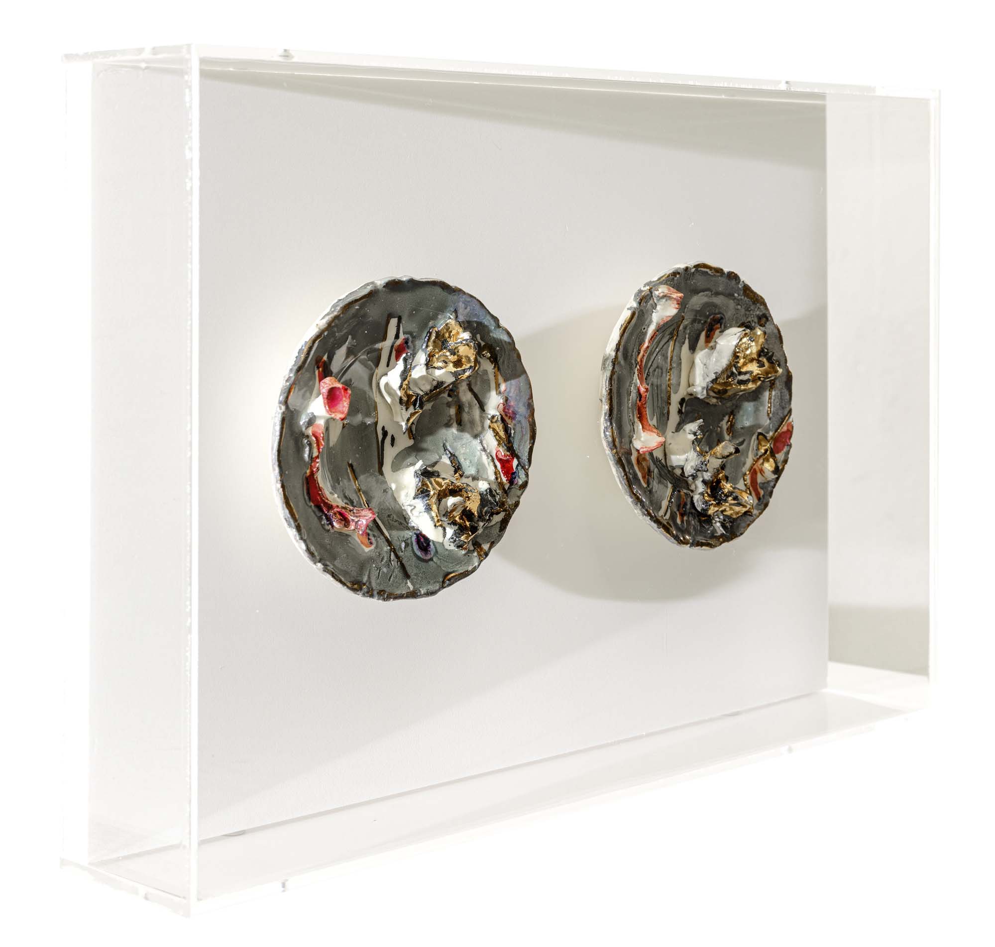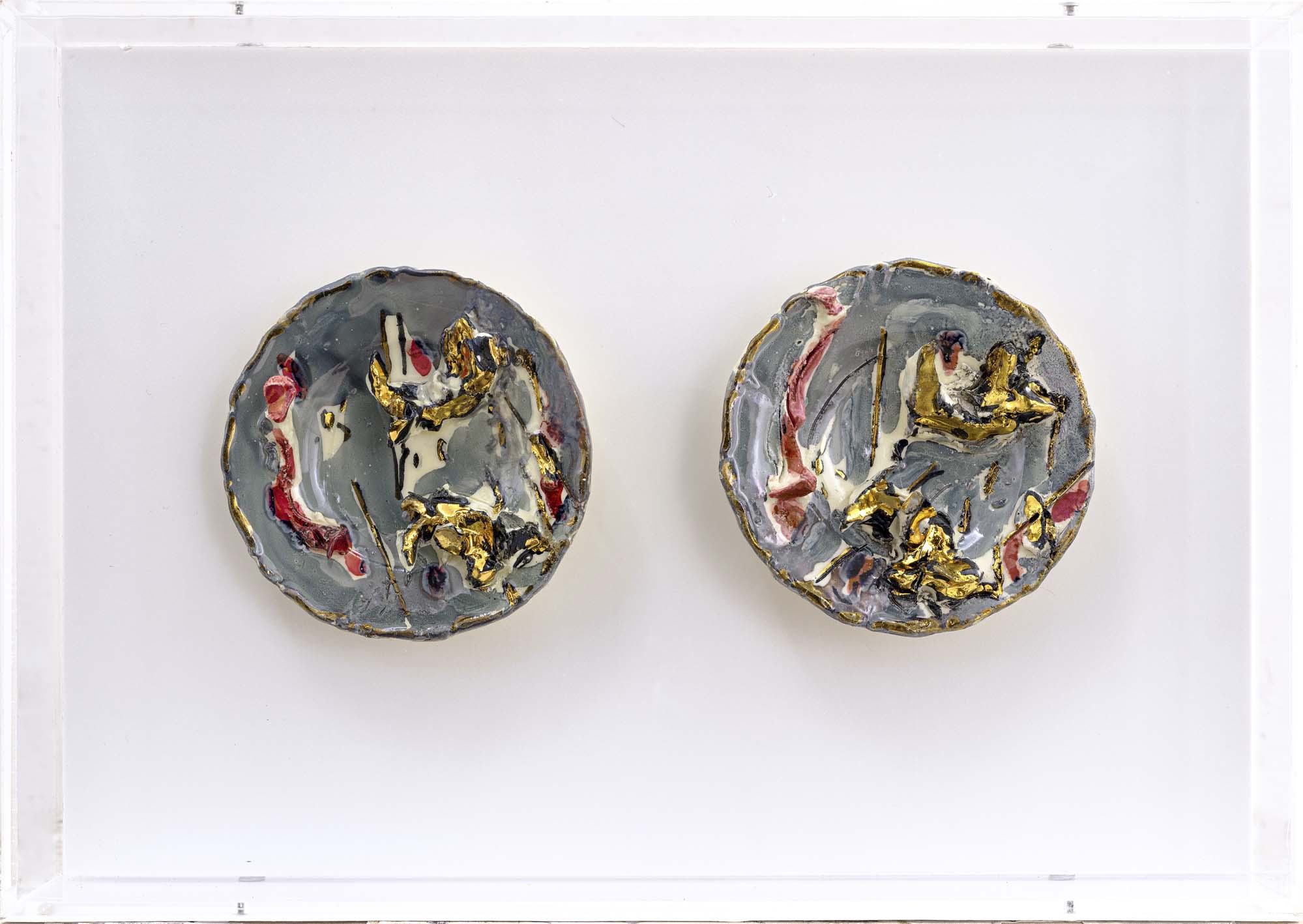 lotto di 2 terrecotte smaltate dipinte e oro a terzo fuoco: verde, rosso e bianco entro teca di plexiglass diam. cm. 9 cad. - entro teca cm. 22x31