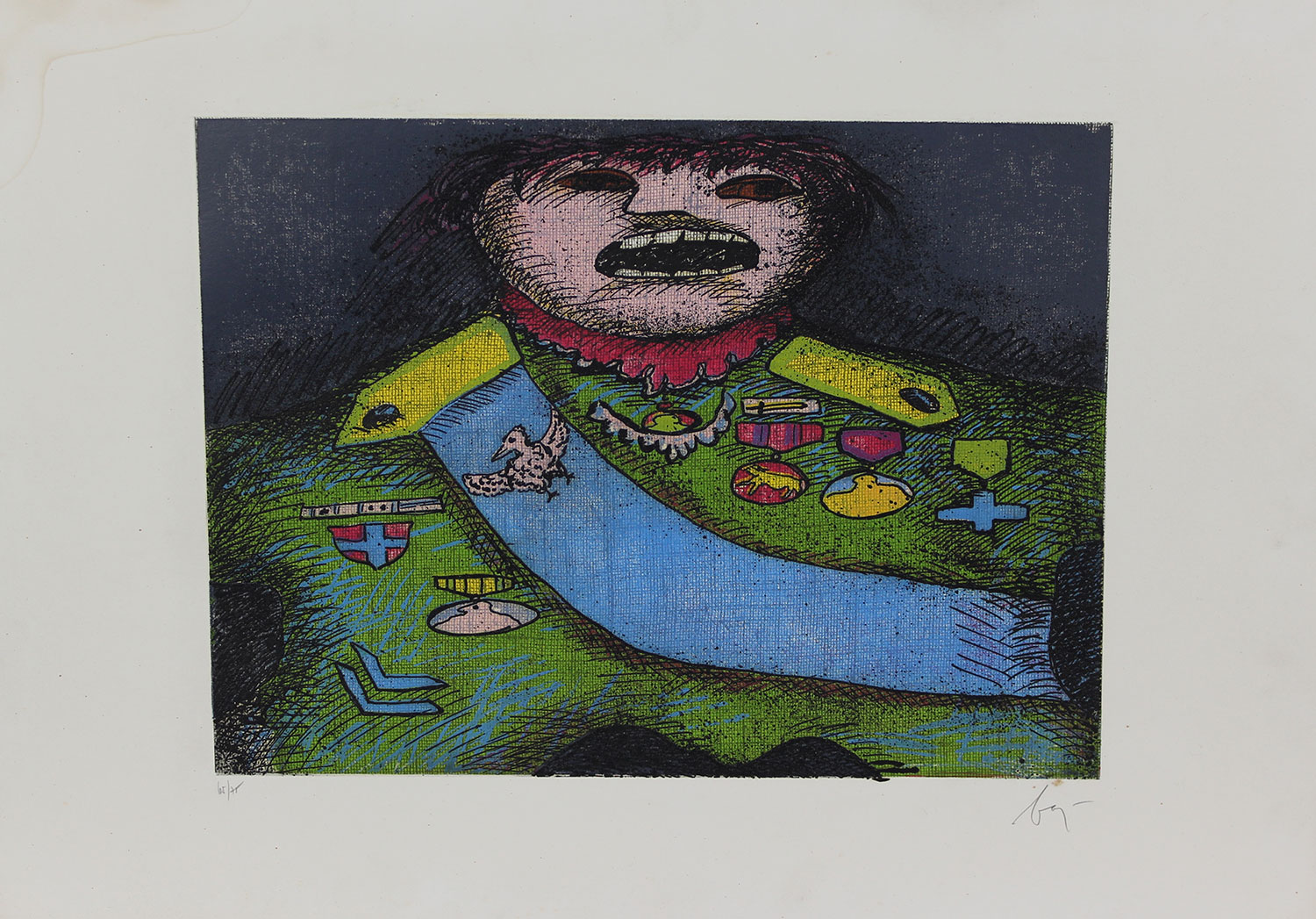 Baj Enrico Senza titolo incisione e serigrafia materica su carta, cm. 53x74 (lastra cm. 36x48,5), es. 65/75 firmata in basso a destra, certificazione su fotografia della Galleria Arte Spiga di Milano, l'opera presenta una macchia di umidità nell'angolo in alto a sinistra e qualche piccola macchia di umidità ai margini senza cornice