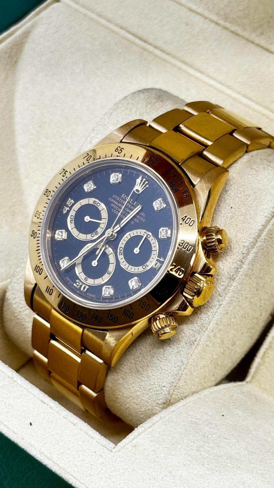 Marca Rolex Modello (Orologio) Daytona Numero di referenza 16528 Carica Automatico Materiale della cassa Oro giallo Materiale cinturino Oro giallo Anno di produzione 1998 Condizione Usato (Ottimo) Corredo Con documenti originali, no box Carica Automatico Calibro di base Zenith El Primero Materiale della cassa Oro giallo Diametro 40 mm Impermeabile 10 ATM Materiale lunetta Oro giallo Vetro Vetro zaffiro Quadrante bianco con diamanti Cinturino Materiale cinturino Oro giallo Colore cinturino Oro Chiusura Déployante Materiale chiusura Oro giallo Funzioni Cronografo - COMMISSIONE D’ASTA 25%
