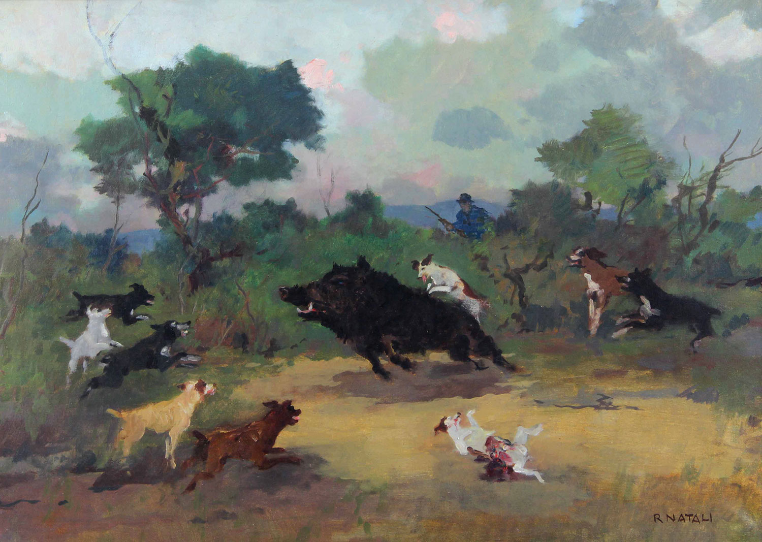 Lotto 457 | Natali Renato Caccia al cinghiale olio su tela, cm. 50x70 firmato in basso a...