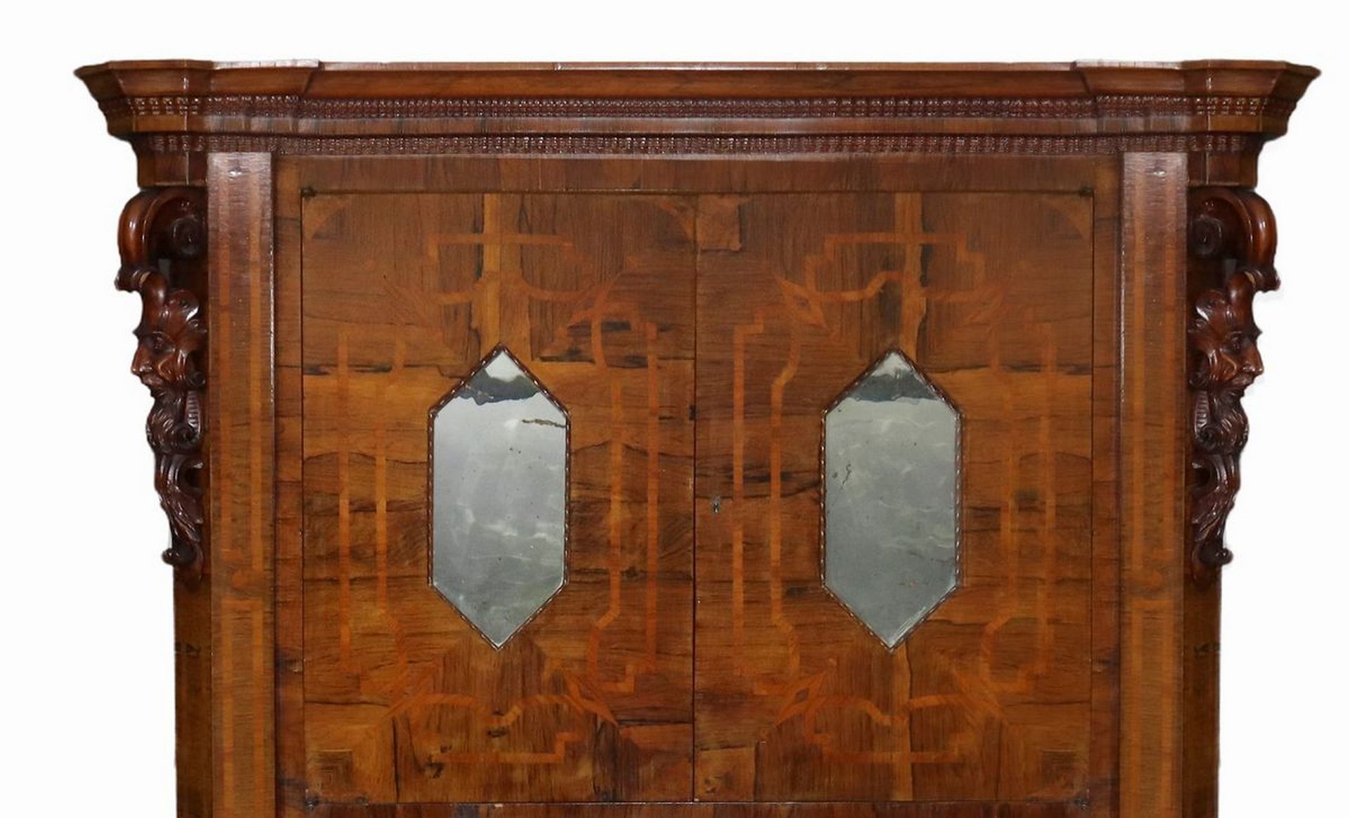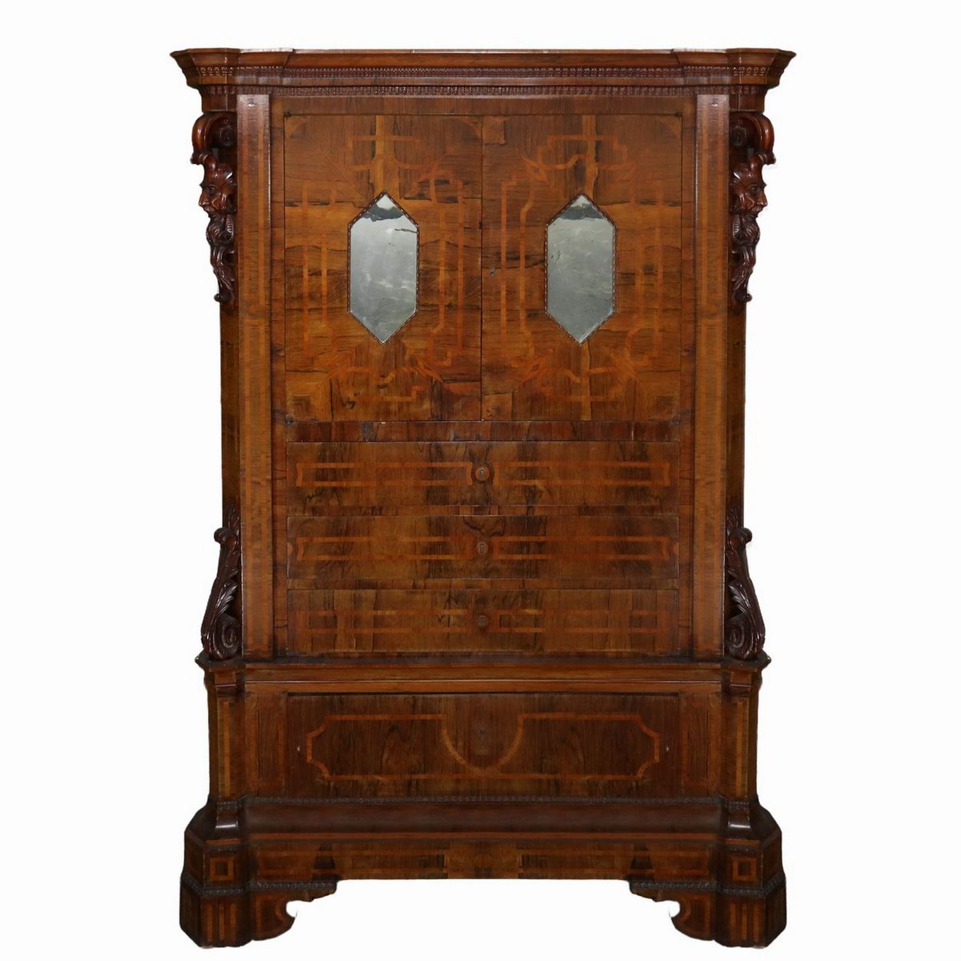 Piccola Schiffonier , 19° secolo Sicilia h cm 178 x 125 x 57 Con inserti di Boise de rose, corpo unico parte superiore a due sportelli con specchi centrali a losanga, parte inferiore con tre cassetti più cassetto alla base più grande ,sculture con mascheroni intagliati a foglie ai lati, piedi a mensola.