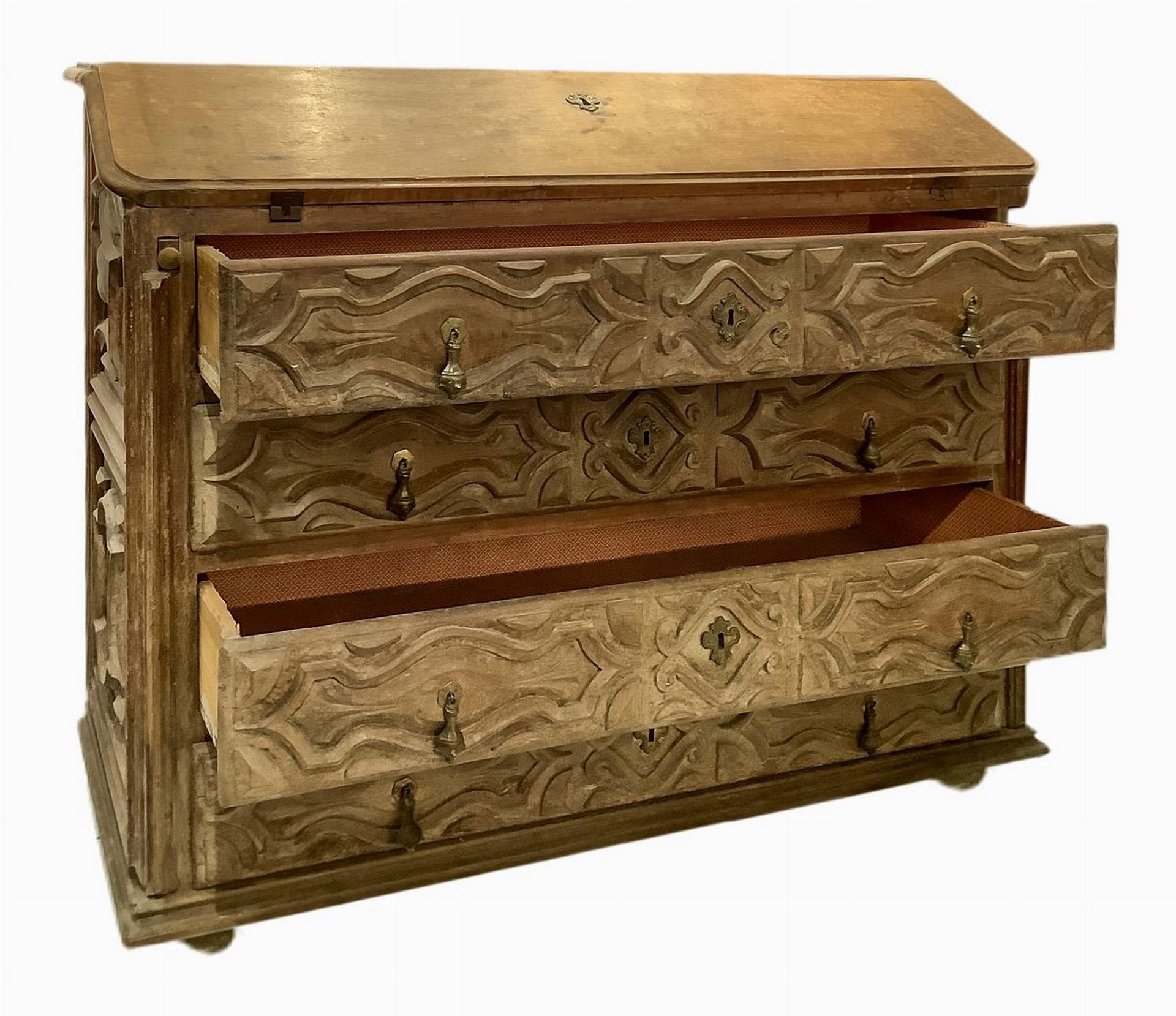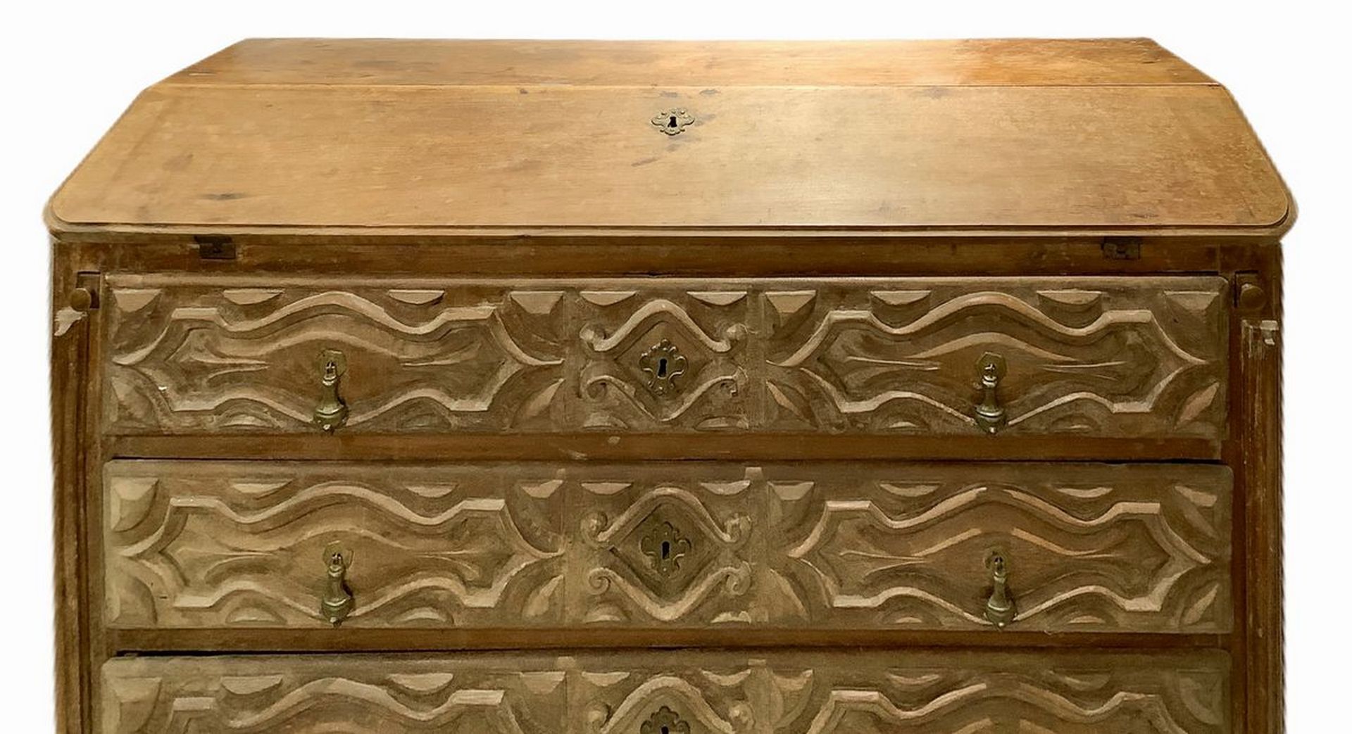 Ribalta in legno di rovere, Francia , XVIII secolo. H cm 108x132x55 Sul fronte quattro cassetti intagliati in tre sezioni con forma oblunga recante pendente a tiretto e al centro bocchetta a forma di giglio. Sui fianchi intagli divisi in due grandi sezioni. Ferramenta originali, piedi rotondi schiacciati.