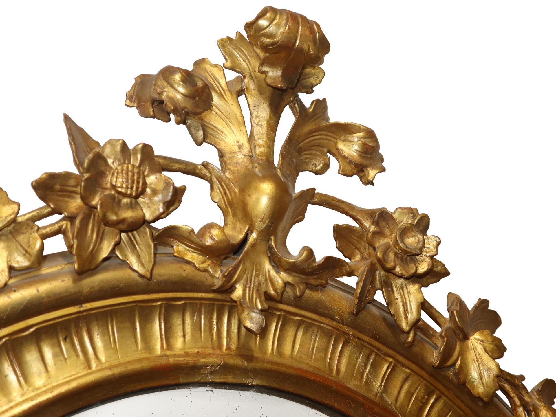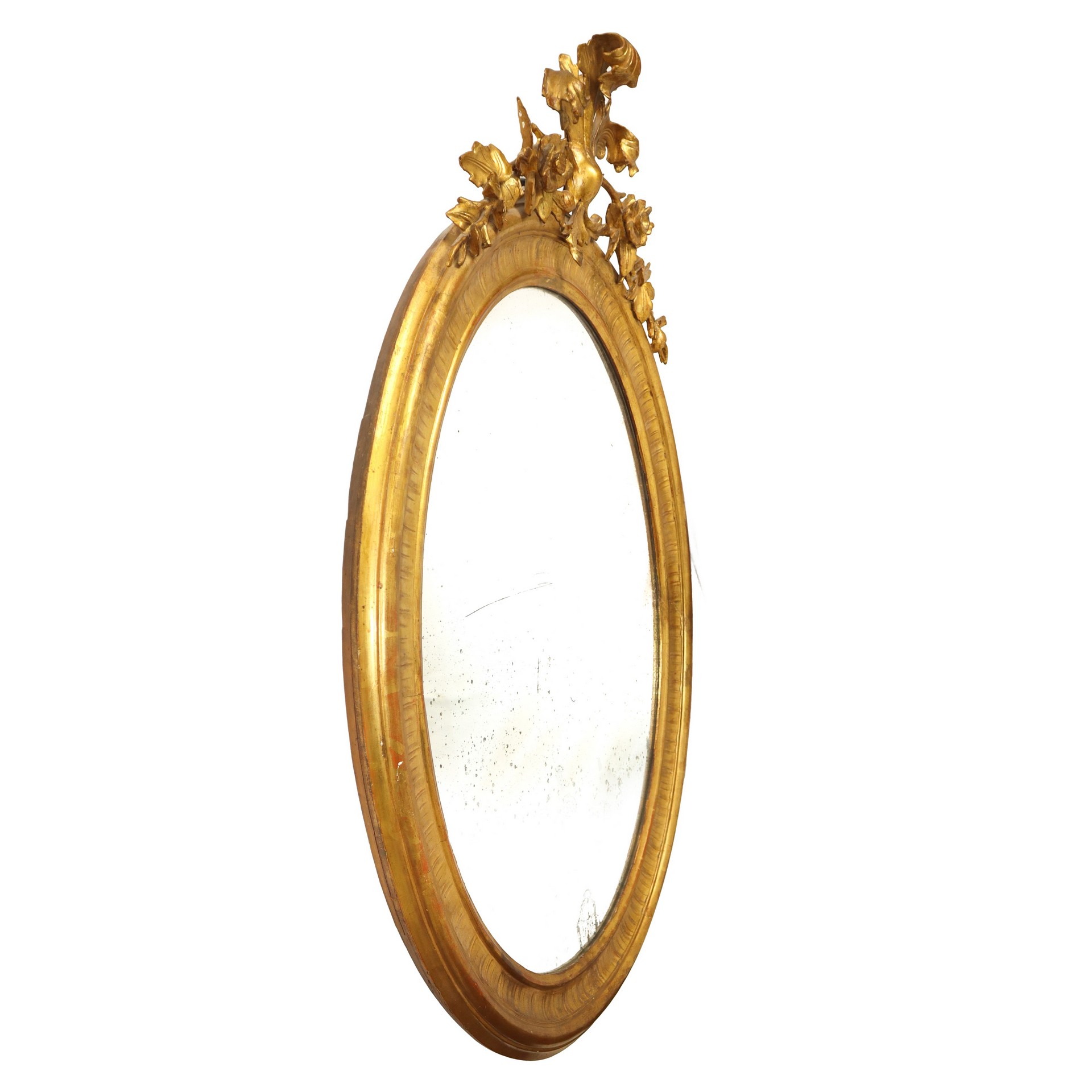 Specchiera ovale in legno dorato h cm 132 diametro cm 90X115 Presenti varie incollature e restauri