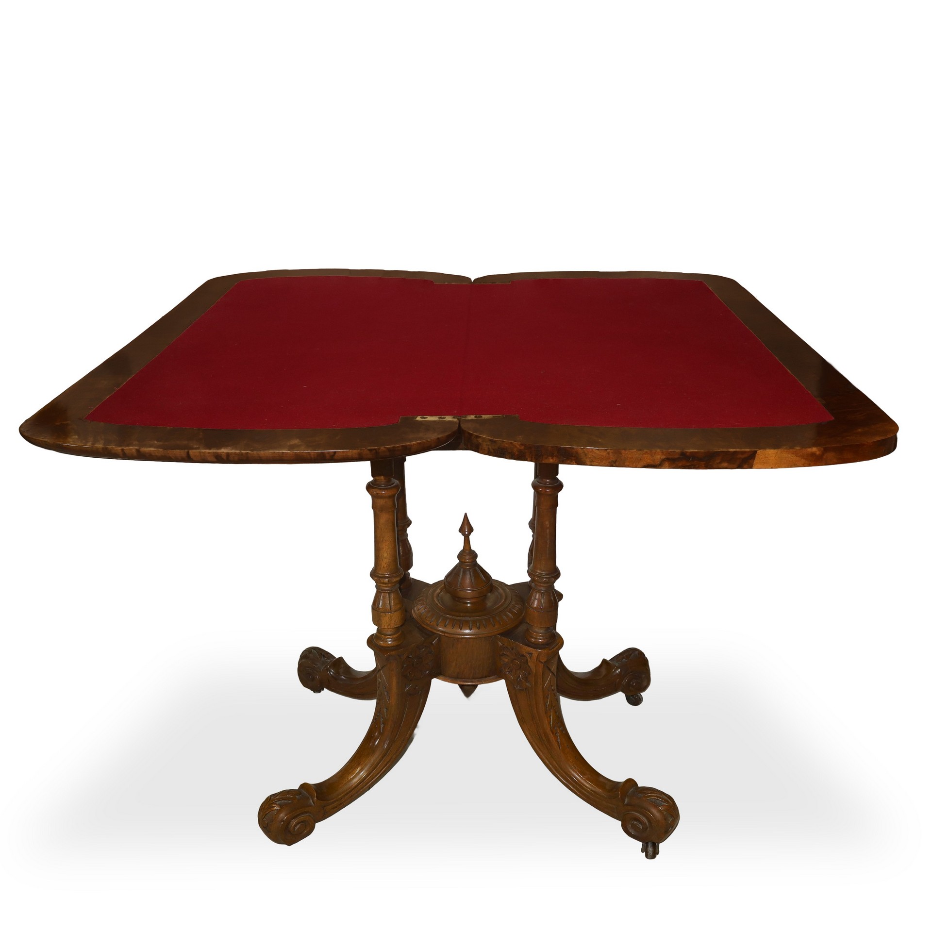 Tavolo da gioco in legno e radica di noce con piede a 4 razze, England 19° secolo