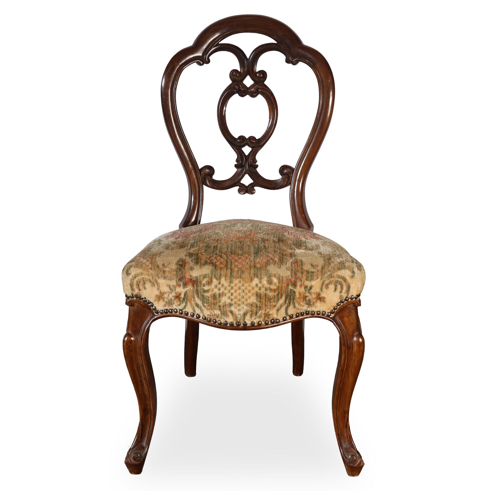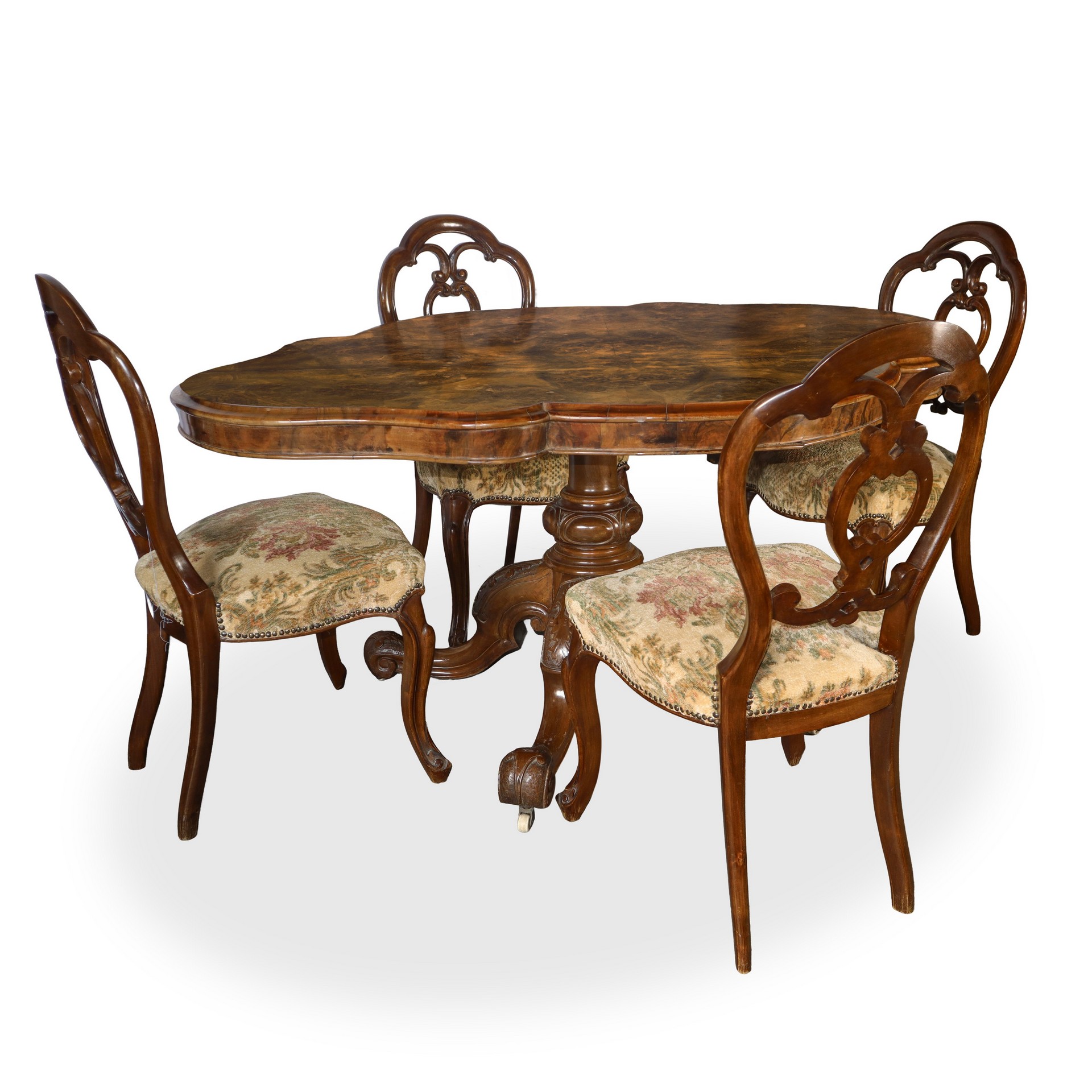 Tavolo a biscotto con piano in radica di noce e piede a 4 razze con rotelle con 5 sedie in tessuto floreale e legno di noce, fine 19° secolo