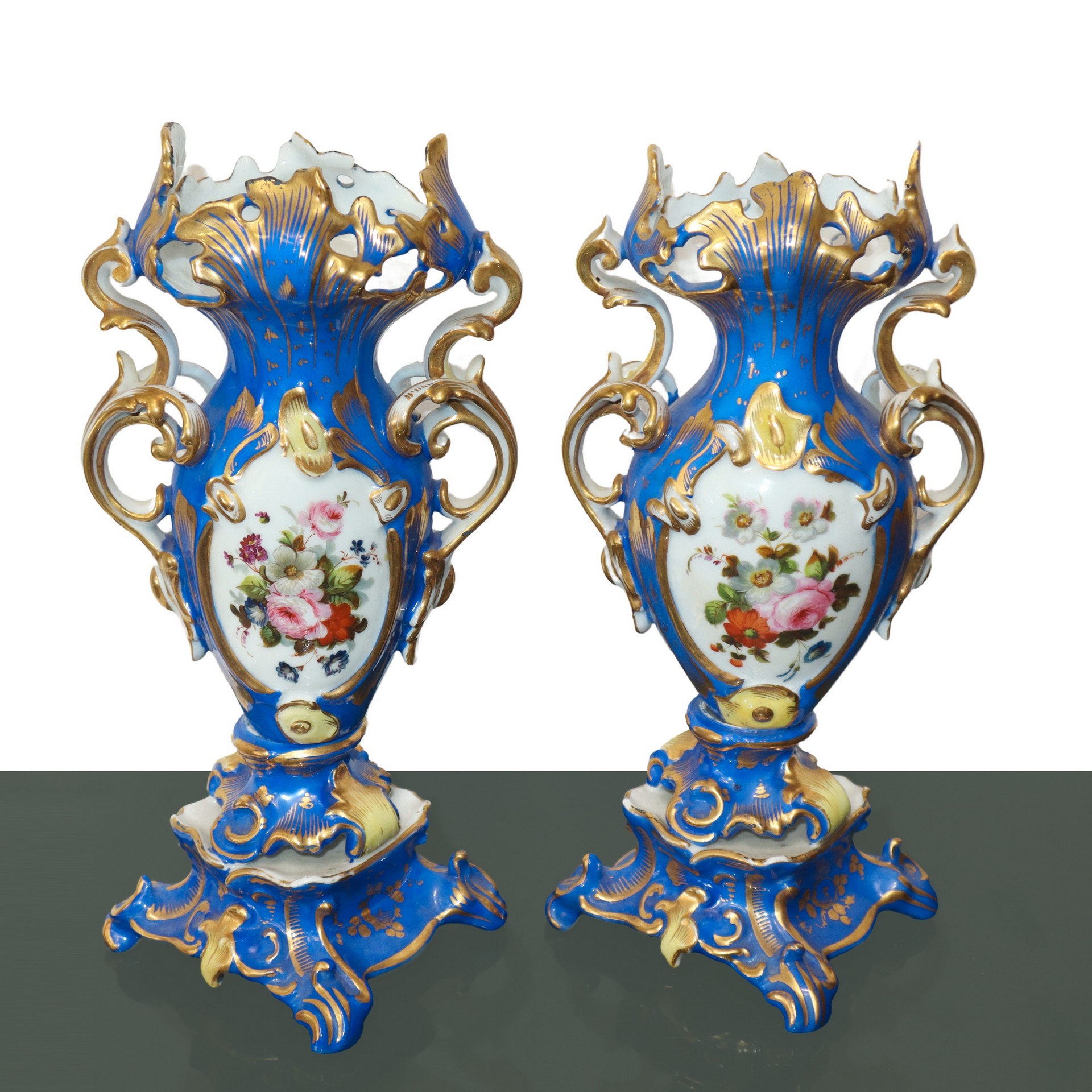 Coppia di vasi in porcellana Luigi Filippo blu e dorati con decori floreali, France 19° secolo h cm 30X15