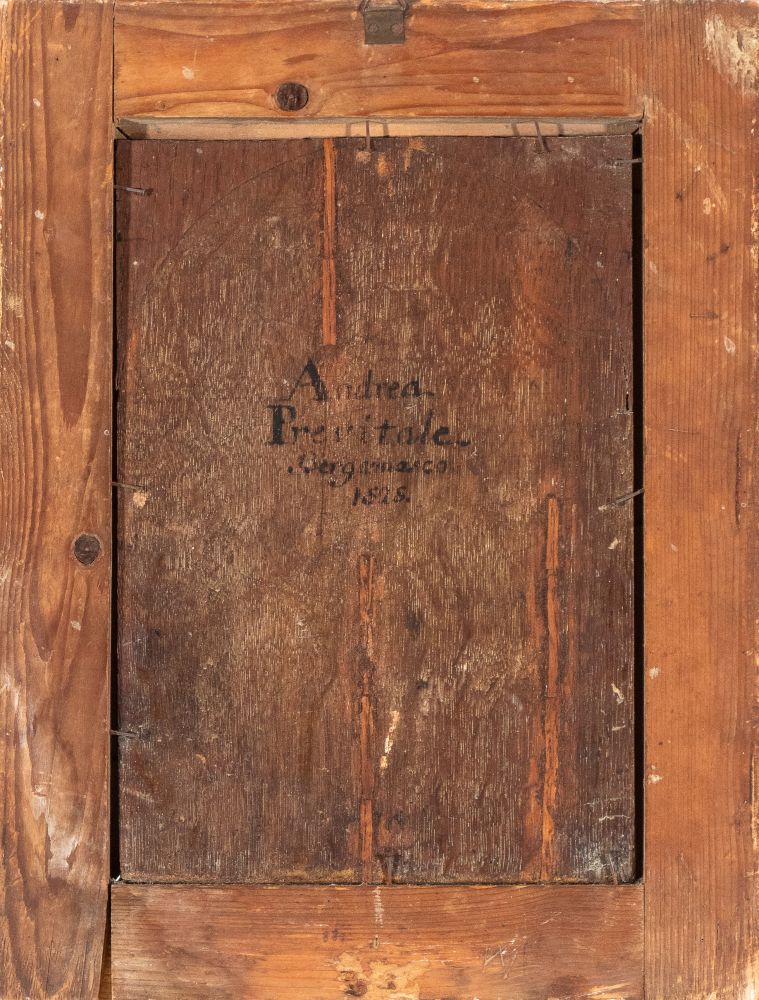 Il dipinto reca a retro antica iscrizione a pennello: "ANDREA / PREDITALE / BERGAMASCO / 1525".