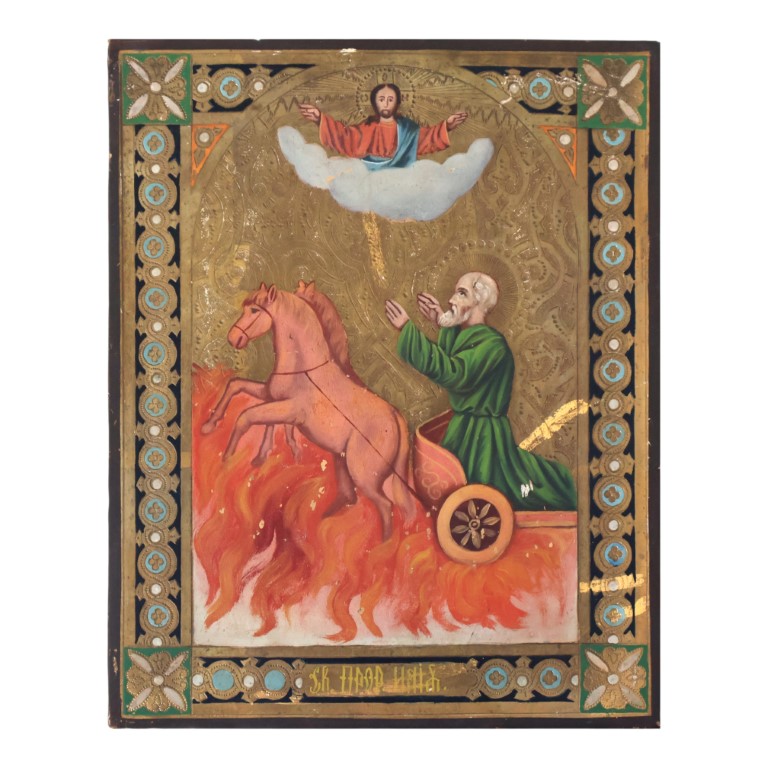 Icona da viaggio su tavola raffigurante l'Ascensione del profeta Elia al cielo su un carro di fuoco