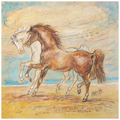GIOVANFRANCESCO GONZAGA Milano 1921 – 2007 I due corsieri 1992 T.m. su carta intelata 30 x 30. Doppia firma in b. a d.; sul verso firme, titolo, tecnica, scritta di autentica, dedica e data.