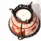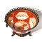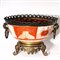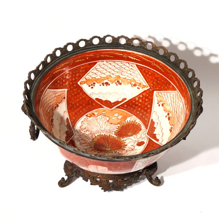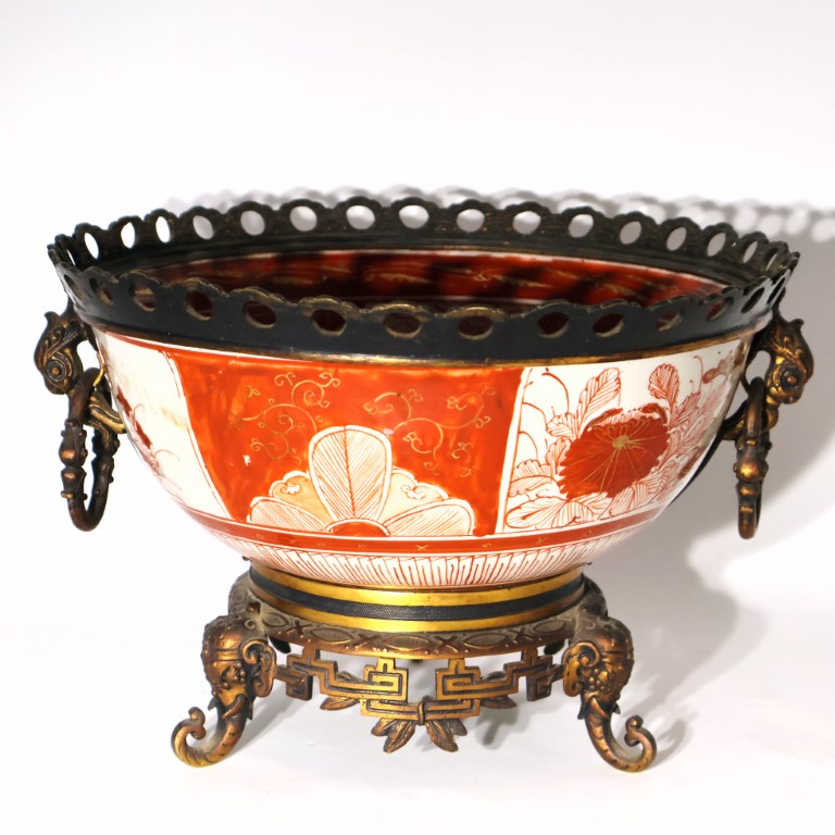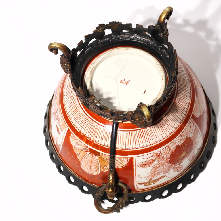 Decorata a riserve bianche su fondo rosso con fiori e figure lumeggiate in oro. Sul fondo presenta marchio.