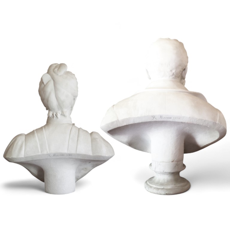 Raffiguranti Giacomo Brufani e sua moglie Mrs Plath Brufani, fondatori dell'Hotel Brufani di Perugia. Firmati e datati 1900. Romano Mignini fu uno scultore importante per Perugia, allievo di Guglielmo Ciani, fu nominato Accademico di Merito dell'Accademia di Belle Arti di Perugia nel 1897.