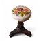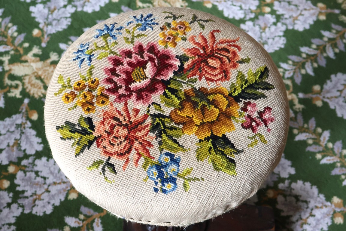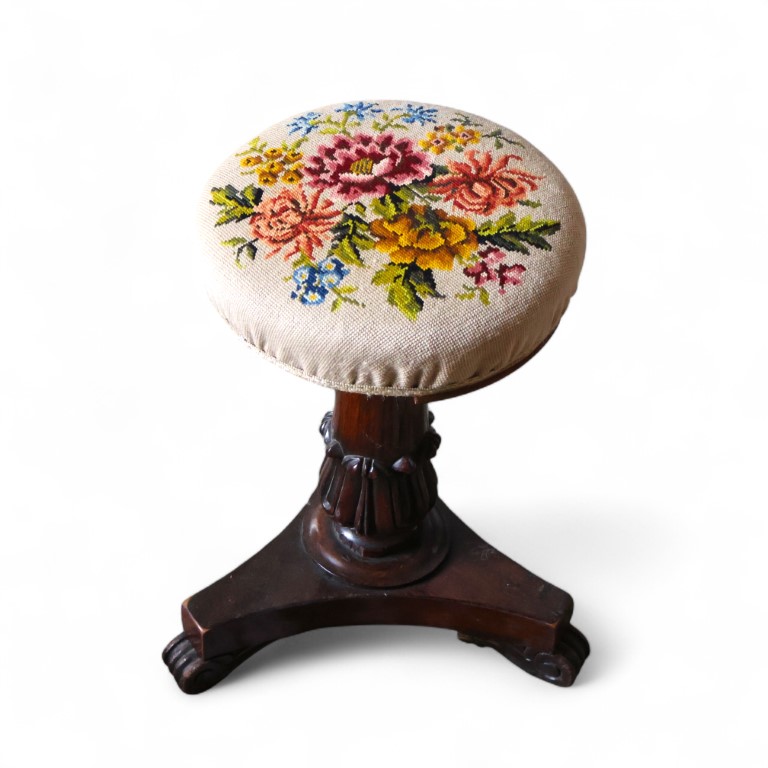 Seduta ricoperta a piccolo punto, fusto a balaustro, base triangolare su tre piedi a voluta.