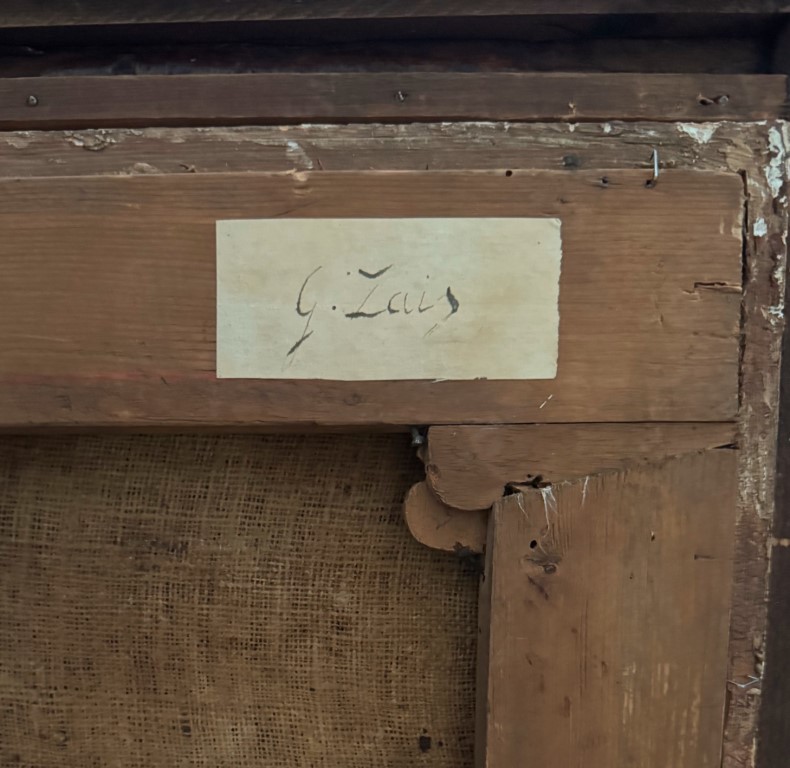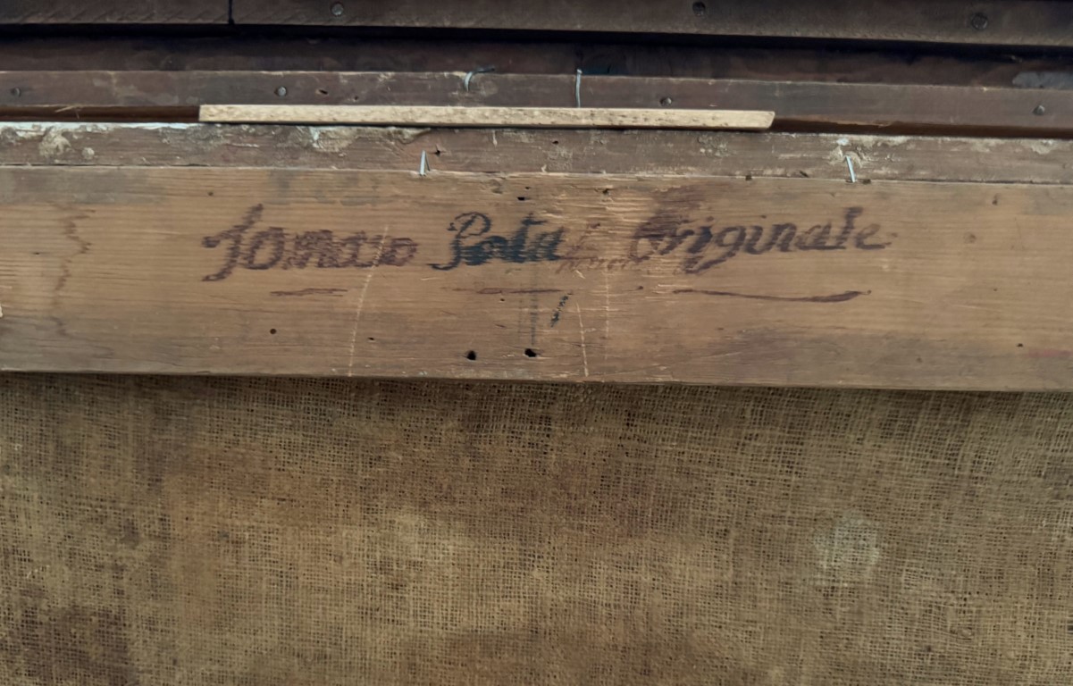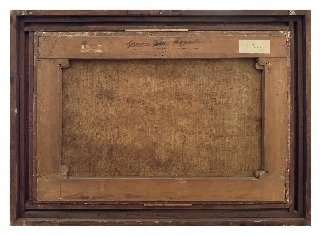 Sul verso del telaio si legge a inchiostro 'Tomaso Porta originale', in corsivo, iscrizione databile tra la fine del XIX e l'inizio del XX secolo, indicativa di una precedente attribuzione a Porta. Sul profilo inferiore della cornice è presente un'etichetta in ottone con il nome 'Giuseppe Zais', riconducibile a una lettura successiva dell'opera.