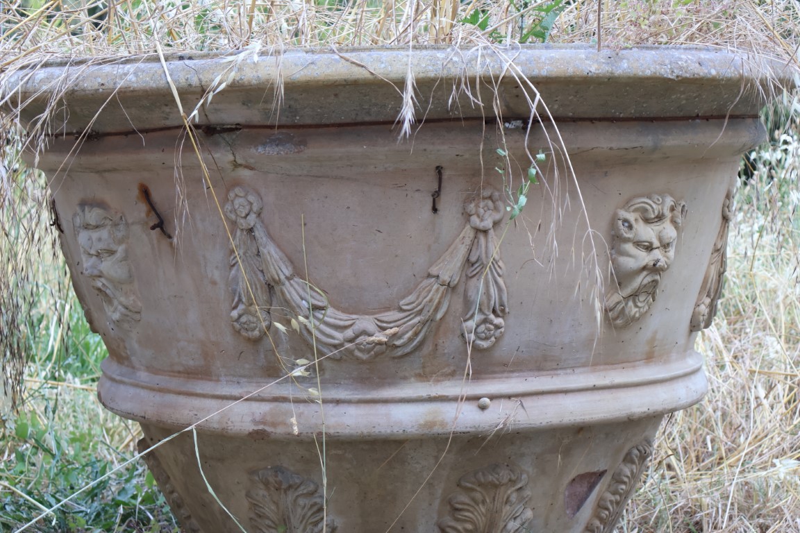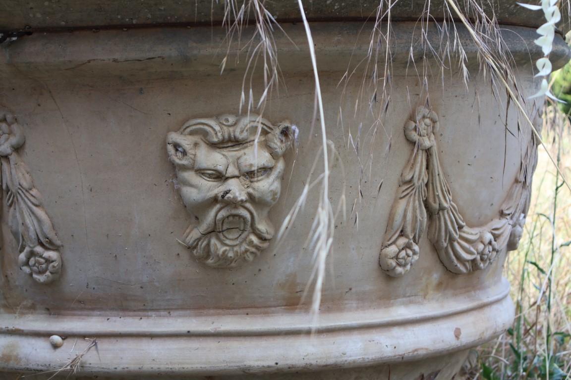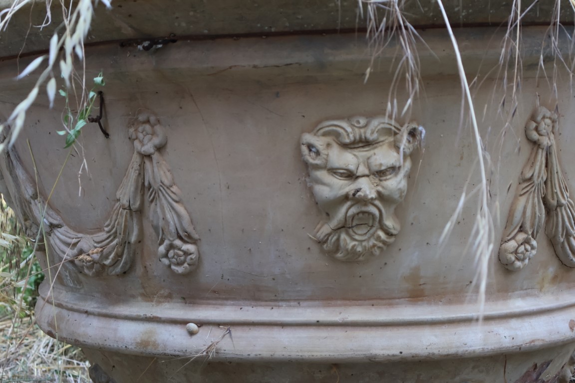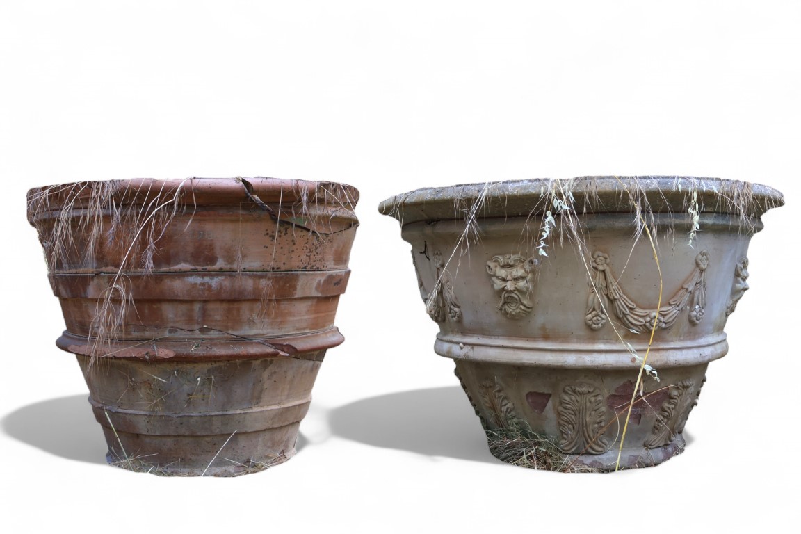 Una decorata con mascheroni e festoni, l'altra con fasce orizzontali.