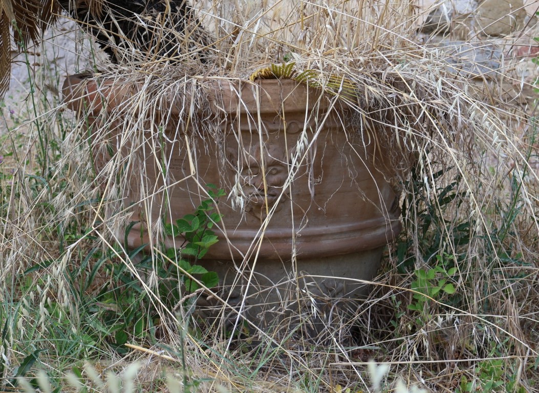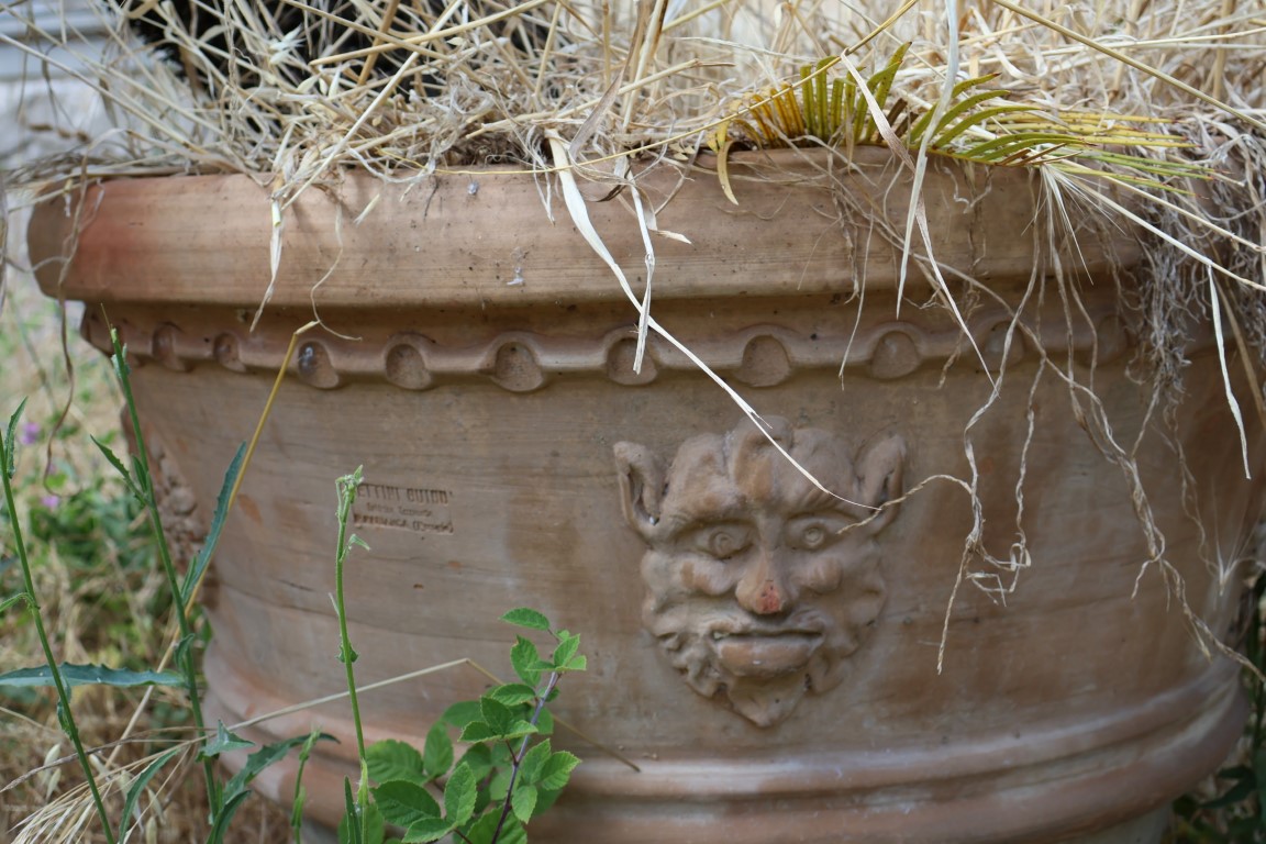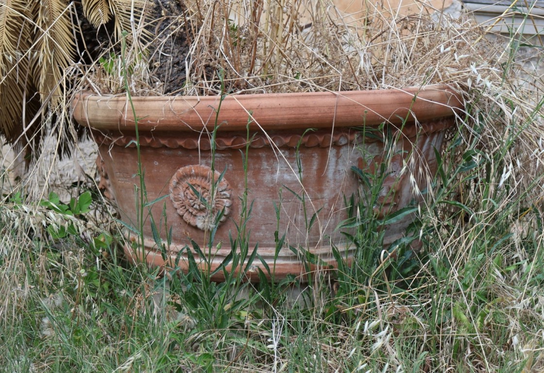 Due conche in terracotta decorate con mascheroni e rosoni