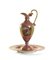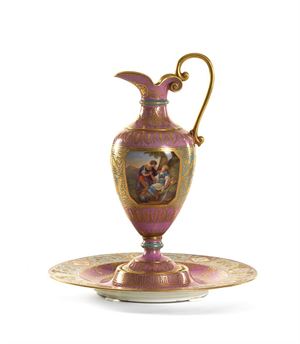 ROYAL VIENNA Versatoio e piatto in ceramica finemente decorata a motivi neoclassici nei colori del rosa, oro e azzurro con decoro centrale scena galante, seconda metà XIX secolo H 38 diam 28 cm A fine ceramic spout and plate with fine decorated neo-classical motifs in shades of pink, gold and blue with central decoration gallant scene, second half of the nineteenth century