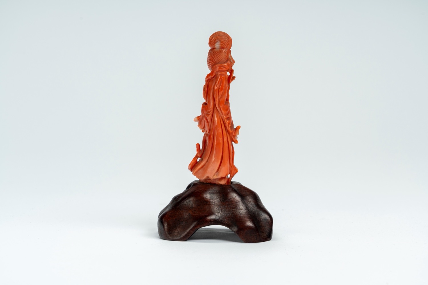 ☼ 珊瑚小雕仕女持扇,木座,中国,20世纪初Lotto accompagnato da perizia per il corallo.