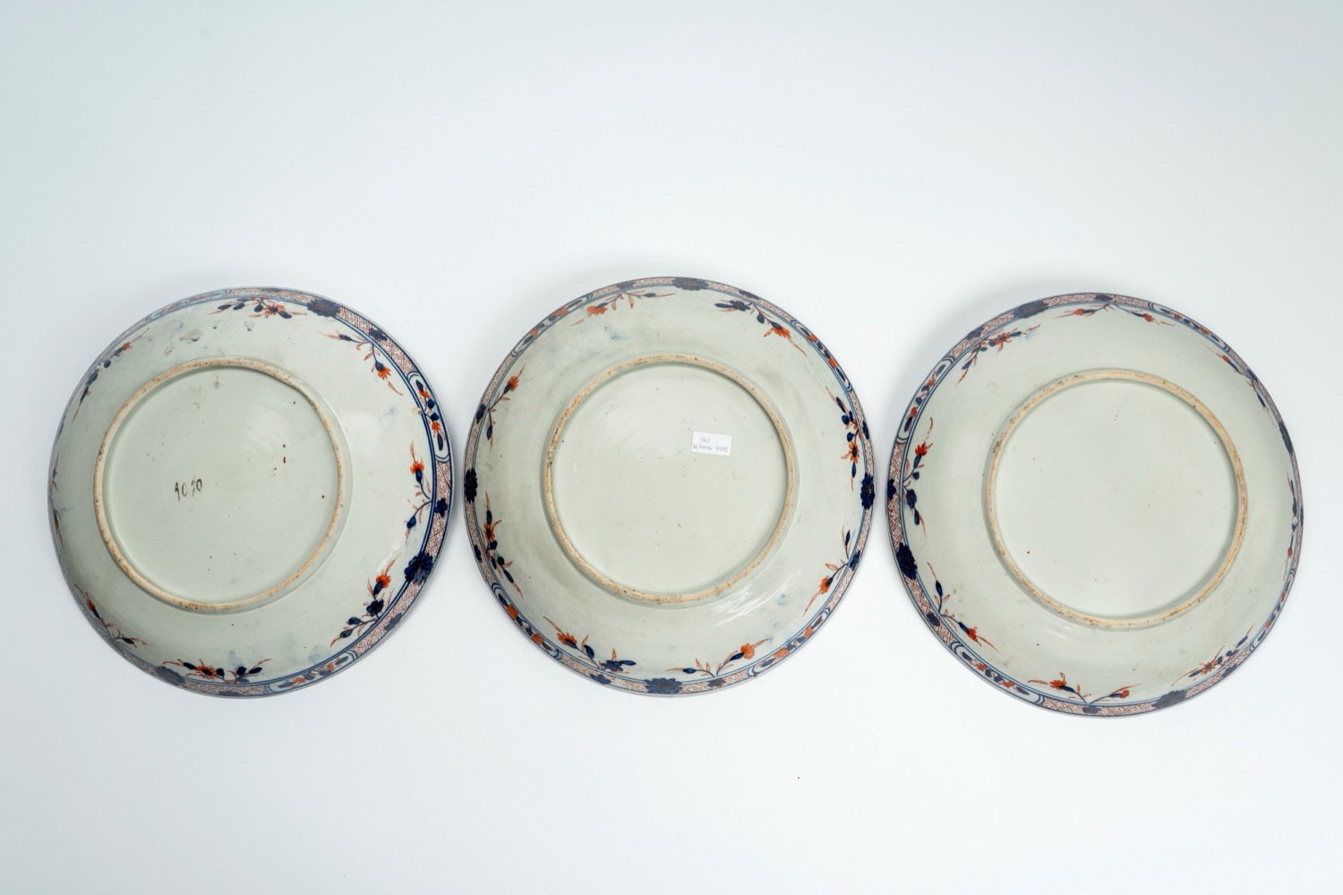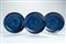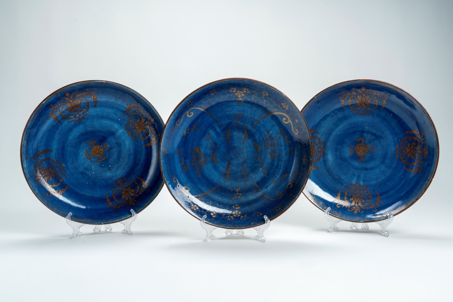 Tre piatti in porcellana con invetriatura powder blue e decori dorati. Cina, secolo XVIII/XIX