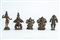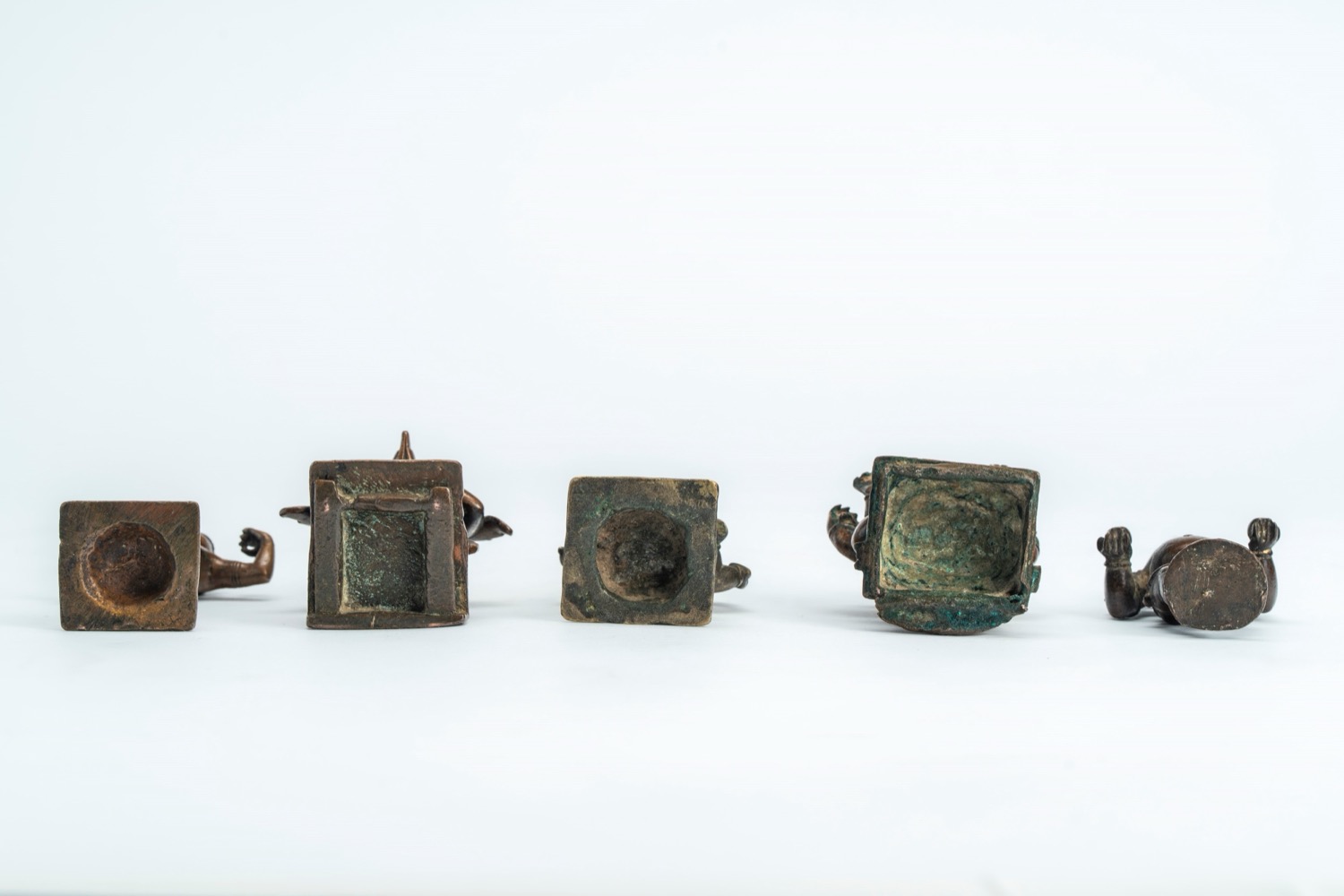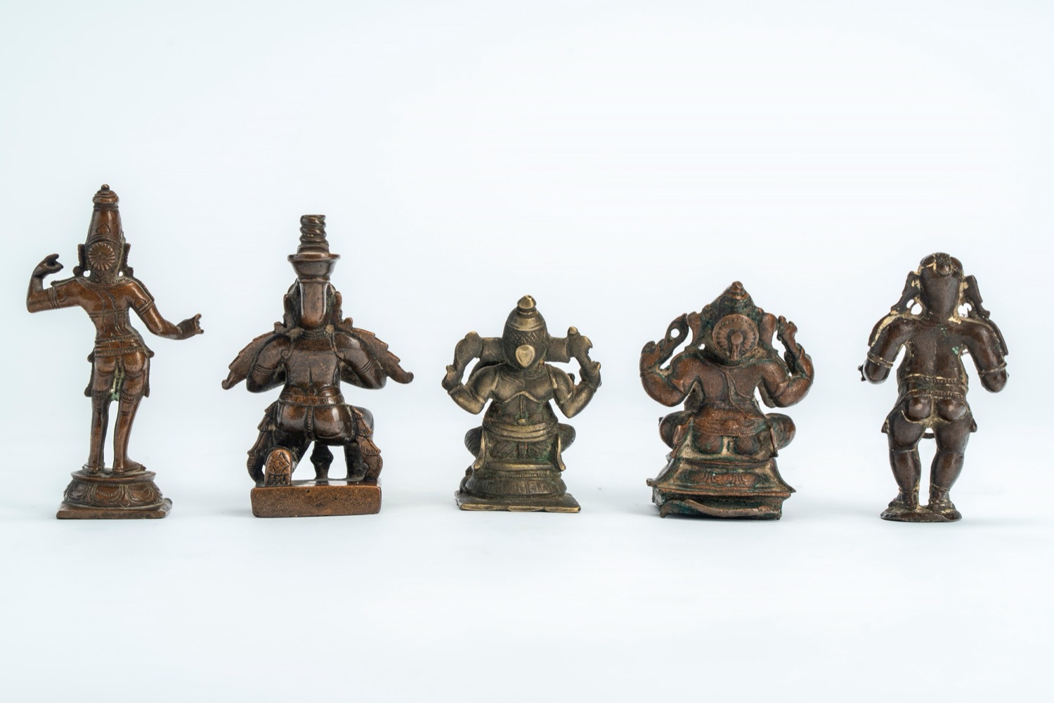 Lotto di cinque piccole sculture in ottone/bronzo due raffiguranti Ganesha, una raffigurante un anjali mudra, una raffigurante un yaksha e un'altra raffigurante Khrishna bambino danzante. India, secolo XIX