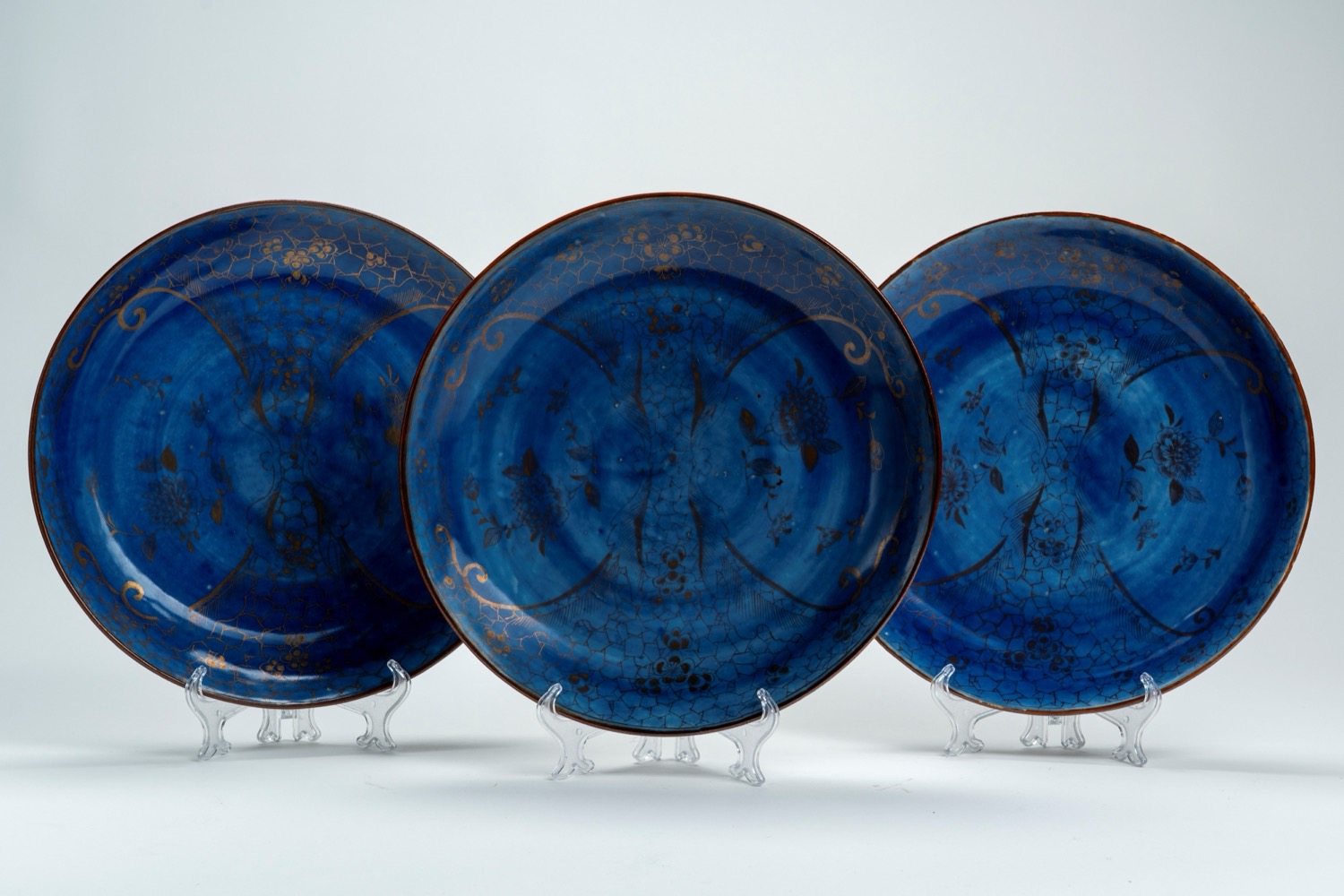 Lotto 23 | Tre piatti in porcellana con invetriatura powder blue e decori dorati. Cina, secolo XVIII/XIX