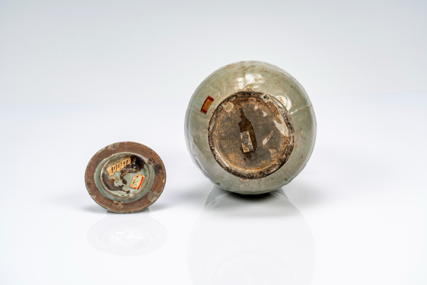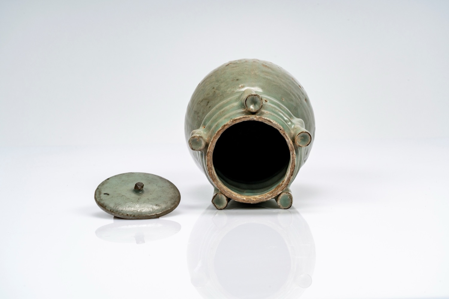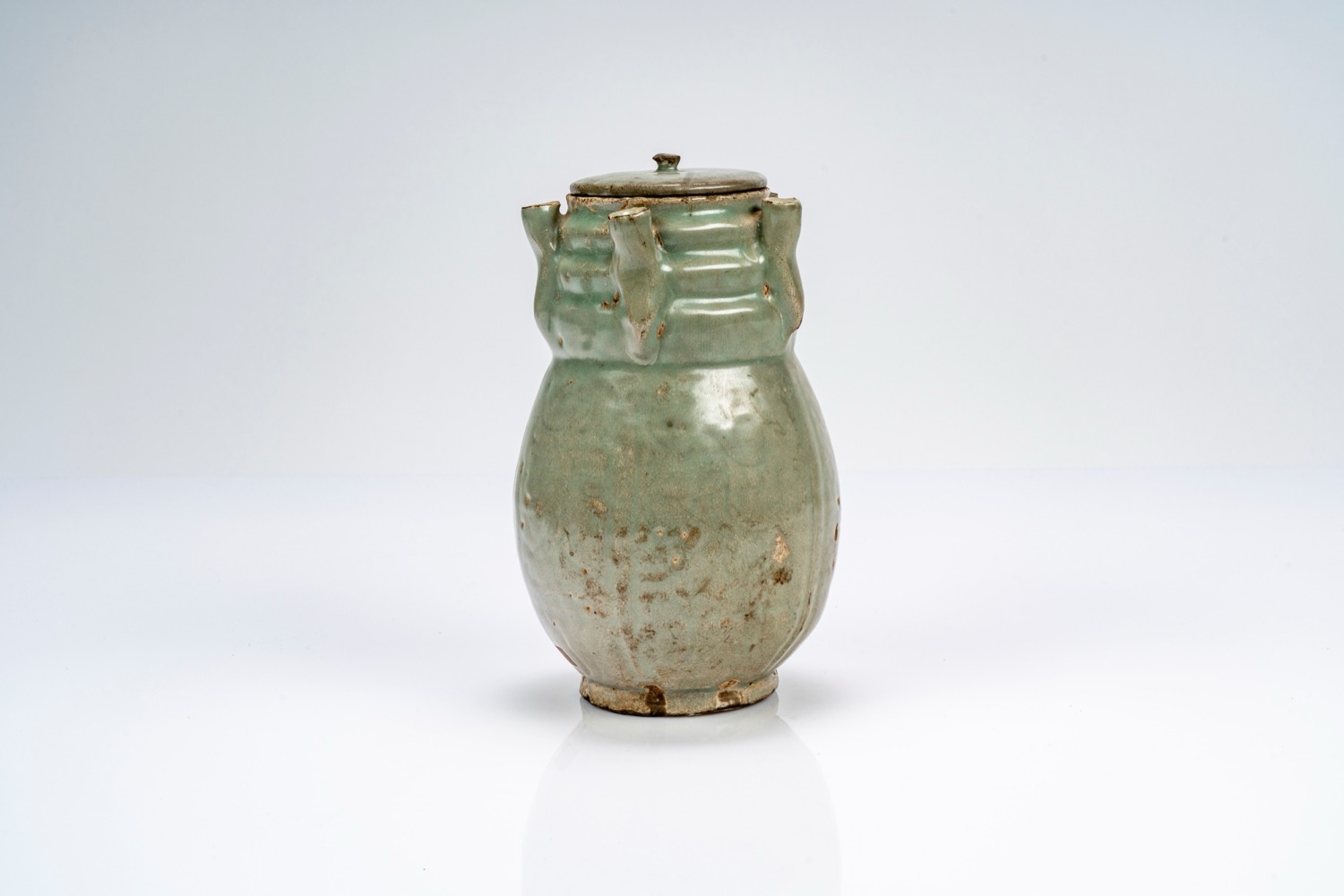Vaso con coperchio con invetriatura azzurra/celadon e cinque beccucci. Cina, dinastia Song/Yuan, secoli XIII/XIV