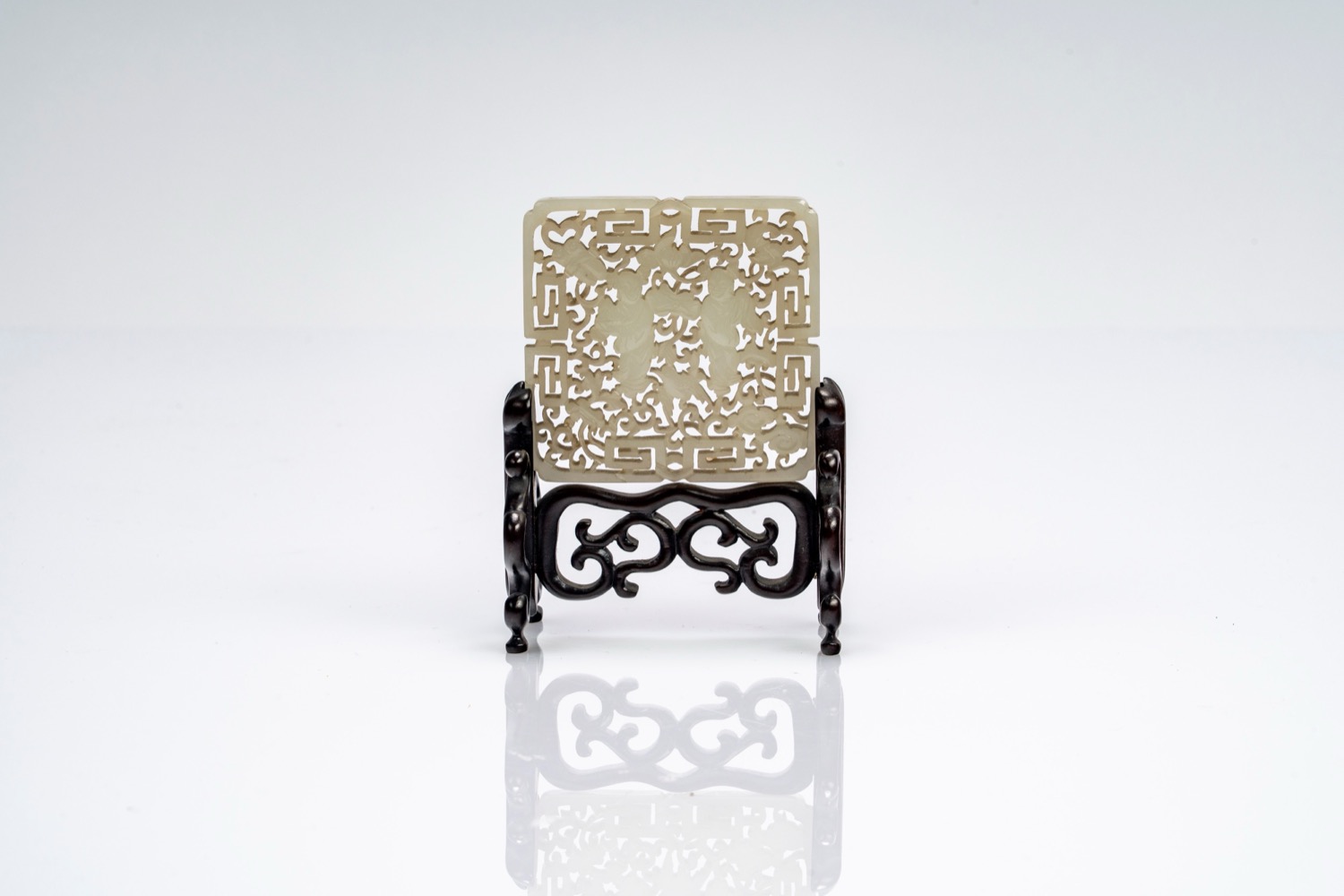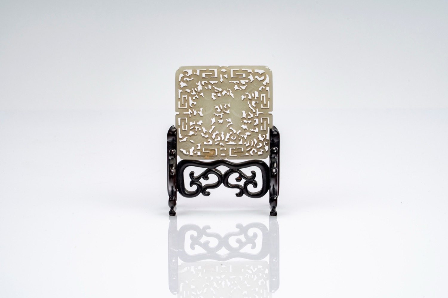 Placca in giada bianca traforata con figure e nuvole stilizzate, su base lignea. Cina, fine secolo XIX