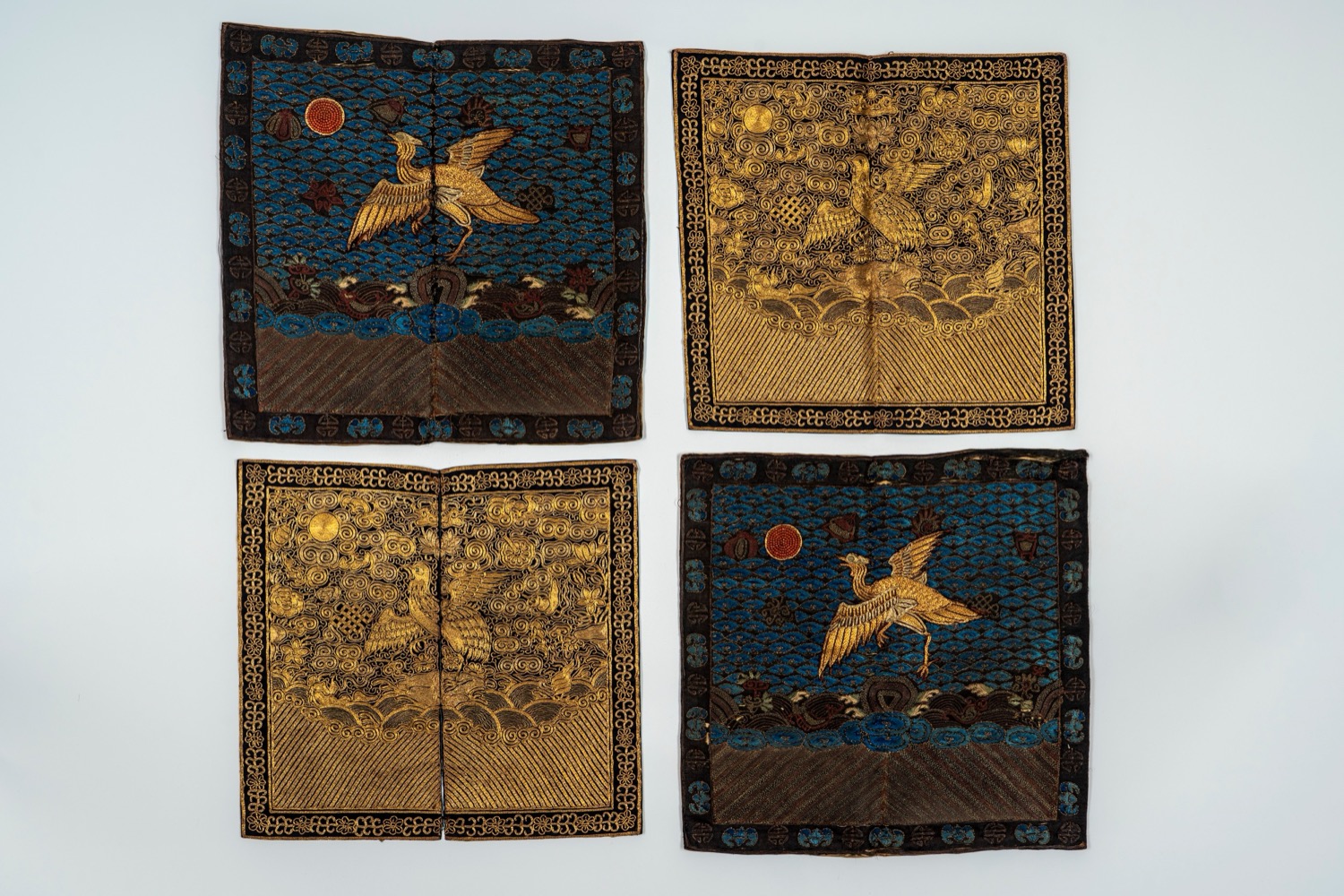 ☼ Quattro banner “buzi” in seta finemente ricamata da funzionario civile di primo rango, di cui due interamente tessuti con fili metallici dorati su fondo scuro e due con sole in perline di corallo. Cina, dinastia Qing, secolo XIX