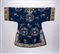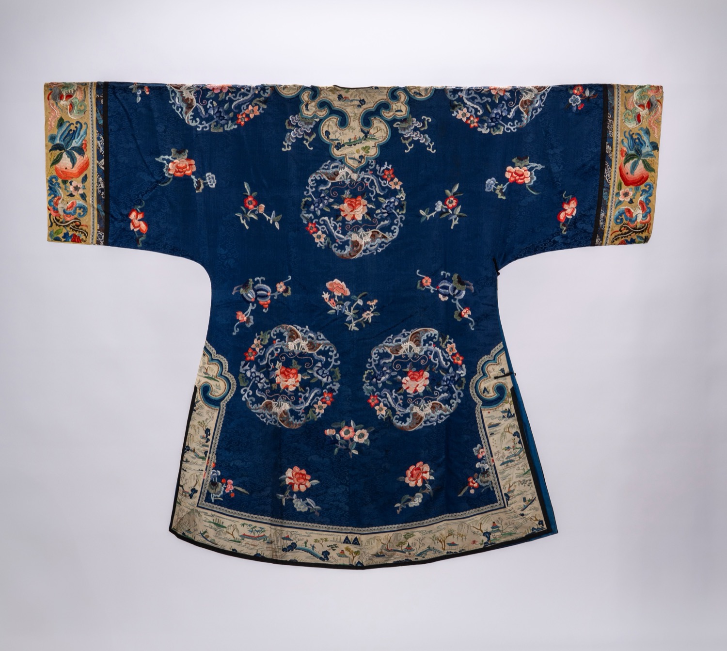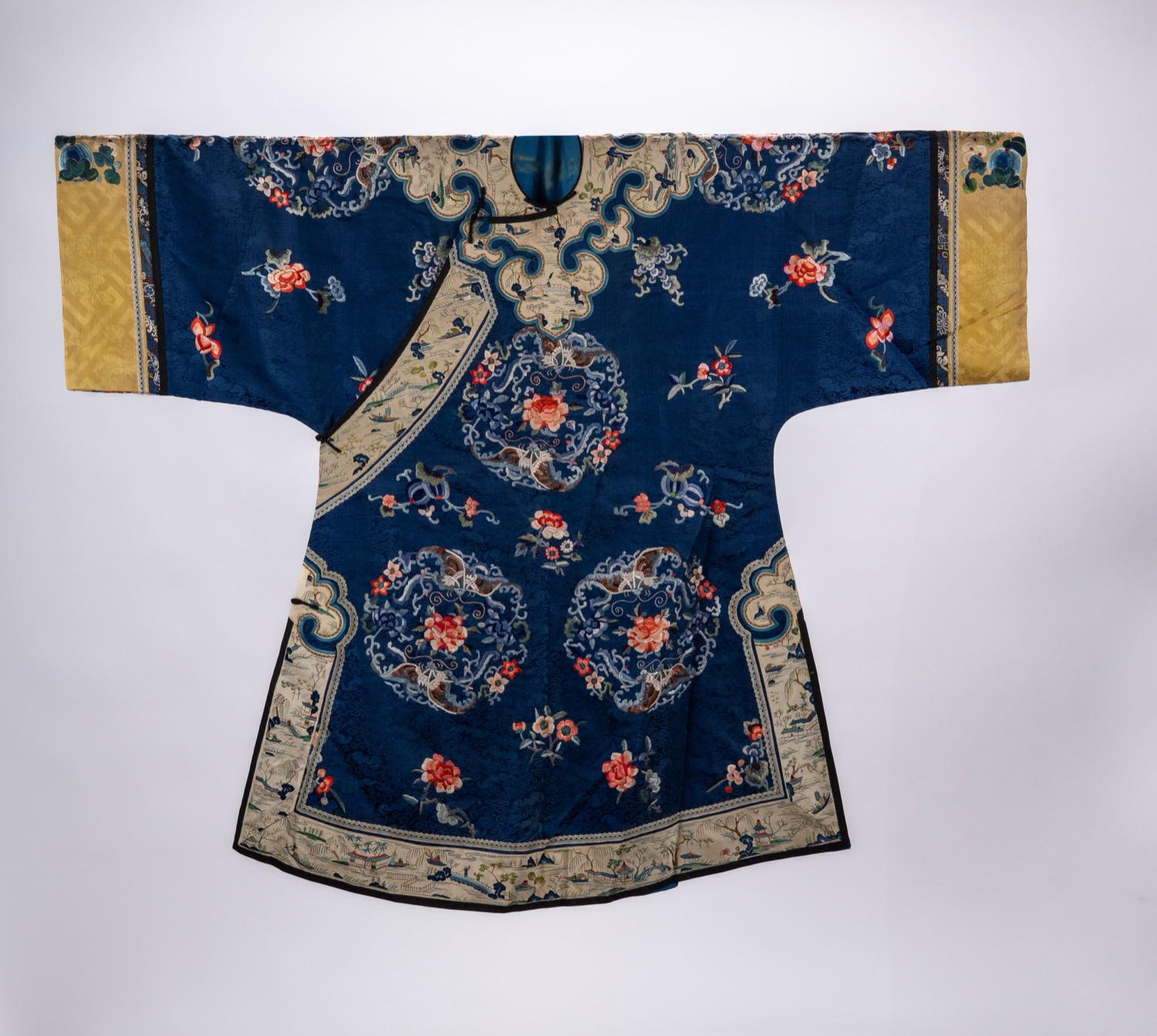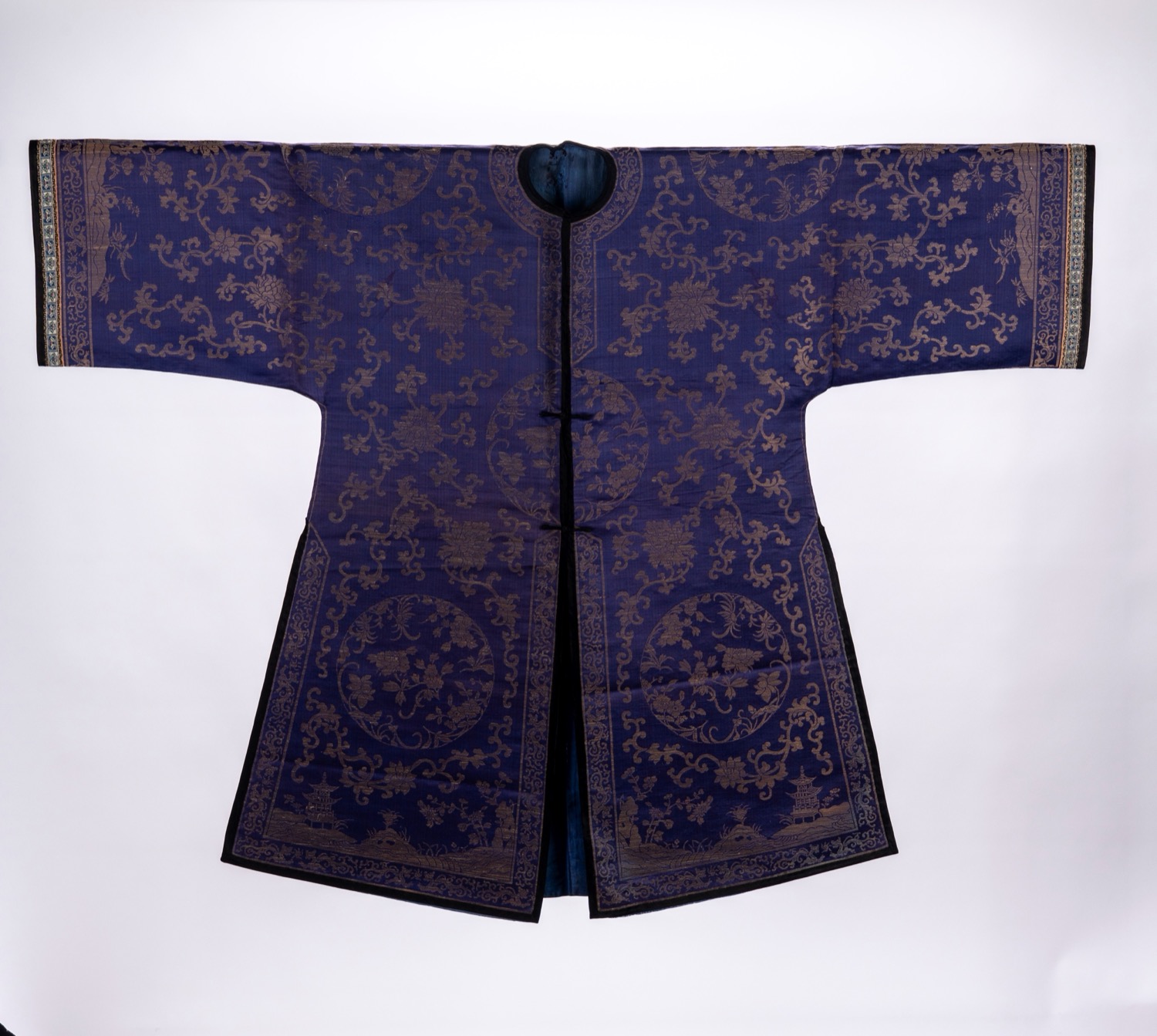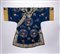 Lotto di due vesti in seta a fondo blu, una decorata con motivi floreali, ruyi e figure, l’altra con motivi monocromi dorati. Cina, fine dinastia Qing