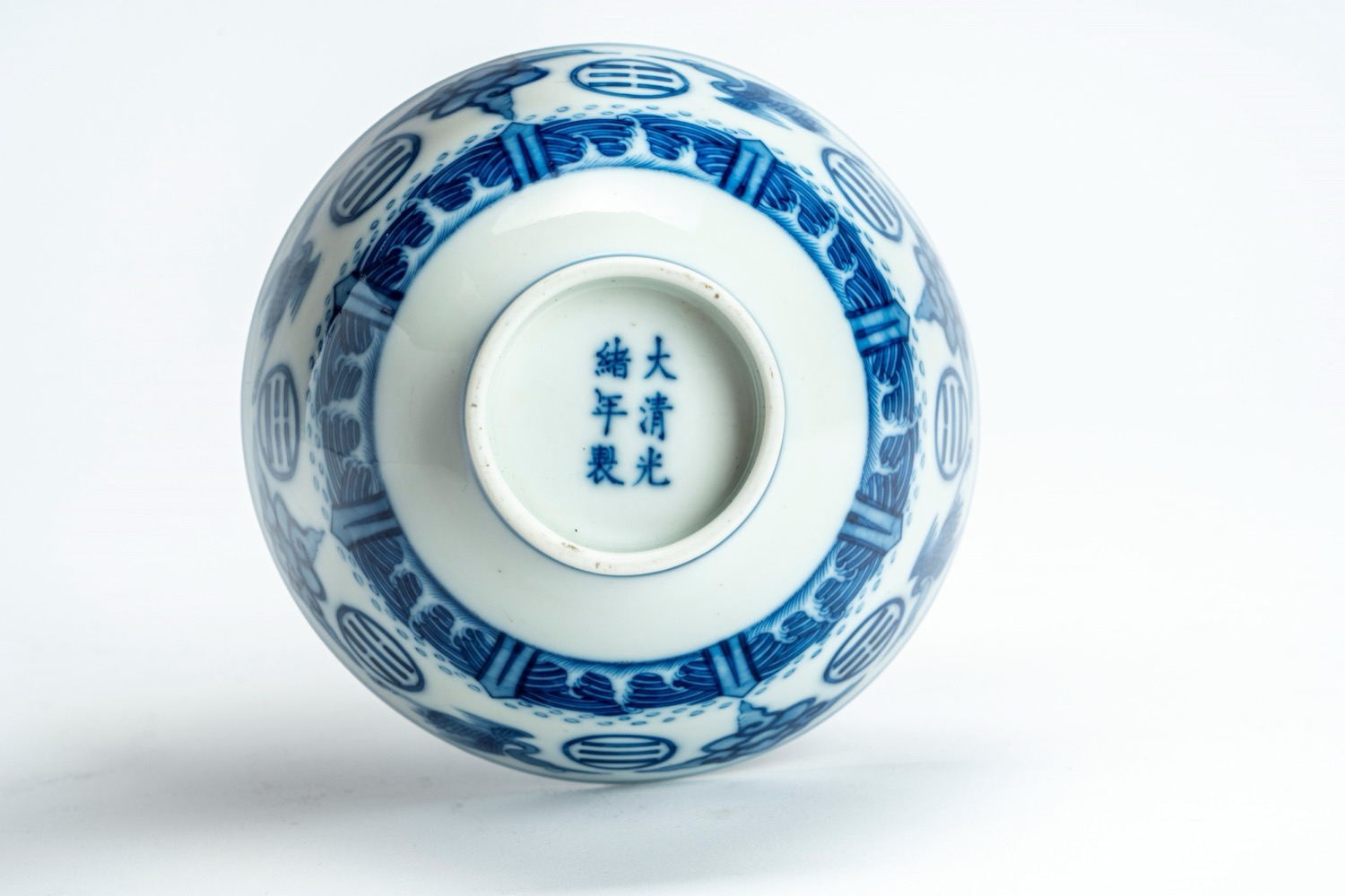 Ciotola in porcellana bianca e blu decorata a motivo di fenici e nuvole stilizzate, recante marchio apocrifo guangxu. Cina, secolo XX