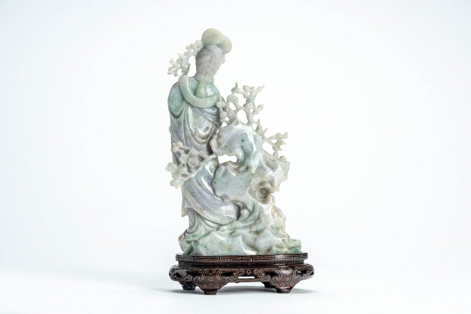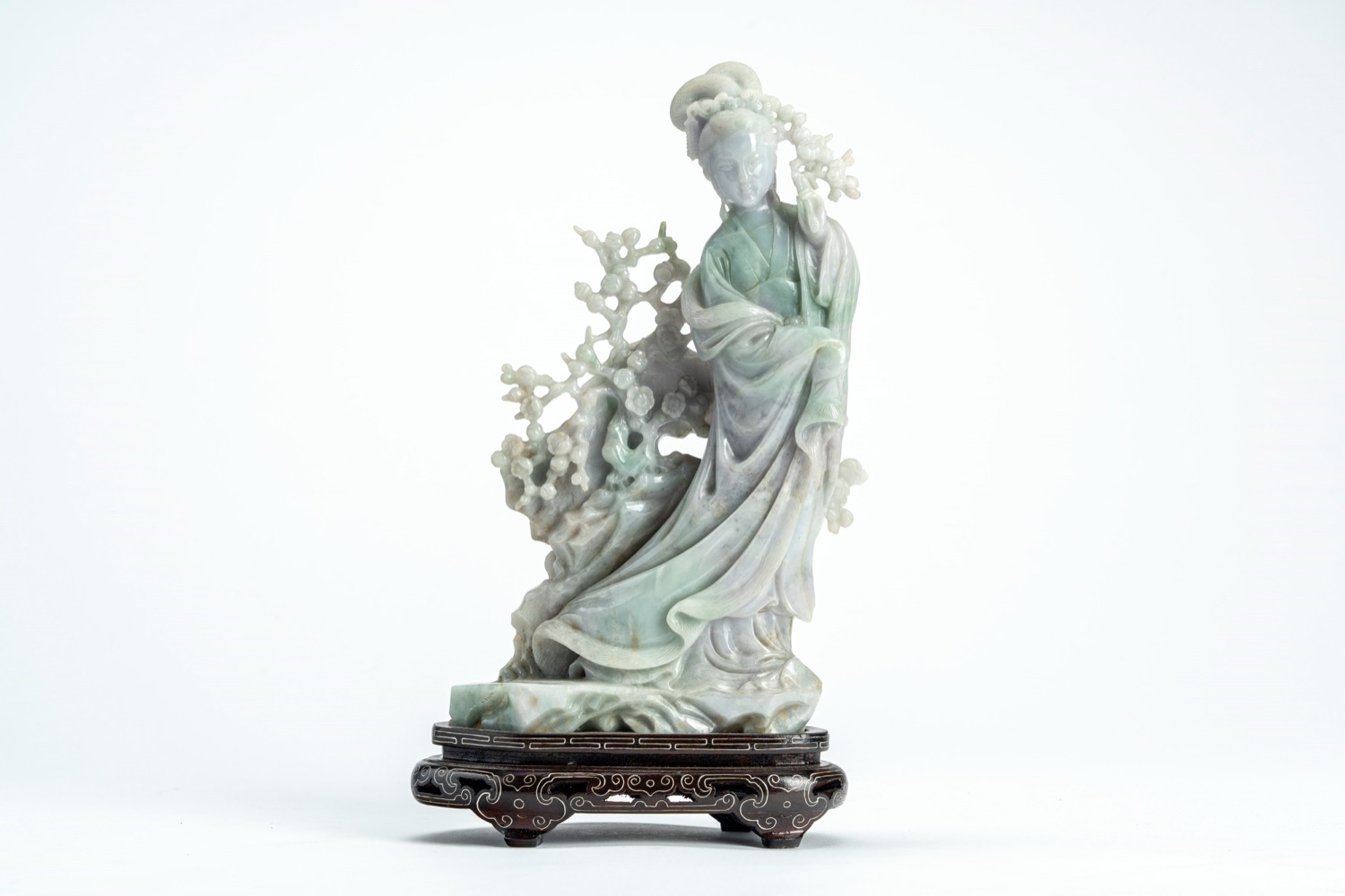 Scultura in giadeite raffigurante una dama dalle lunghe vesti appoggiata a un tronco fiorito. Cina, secolo XX.
