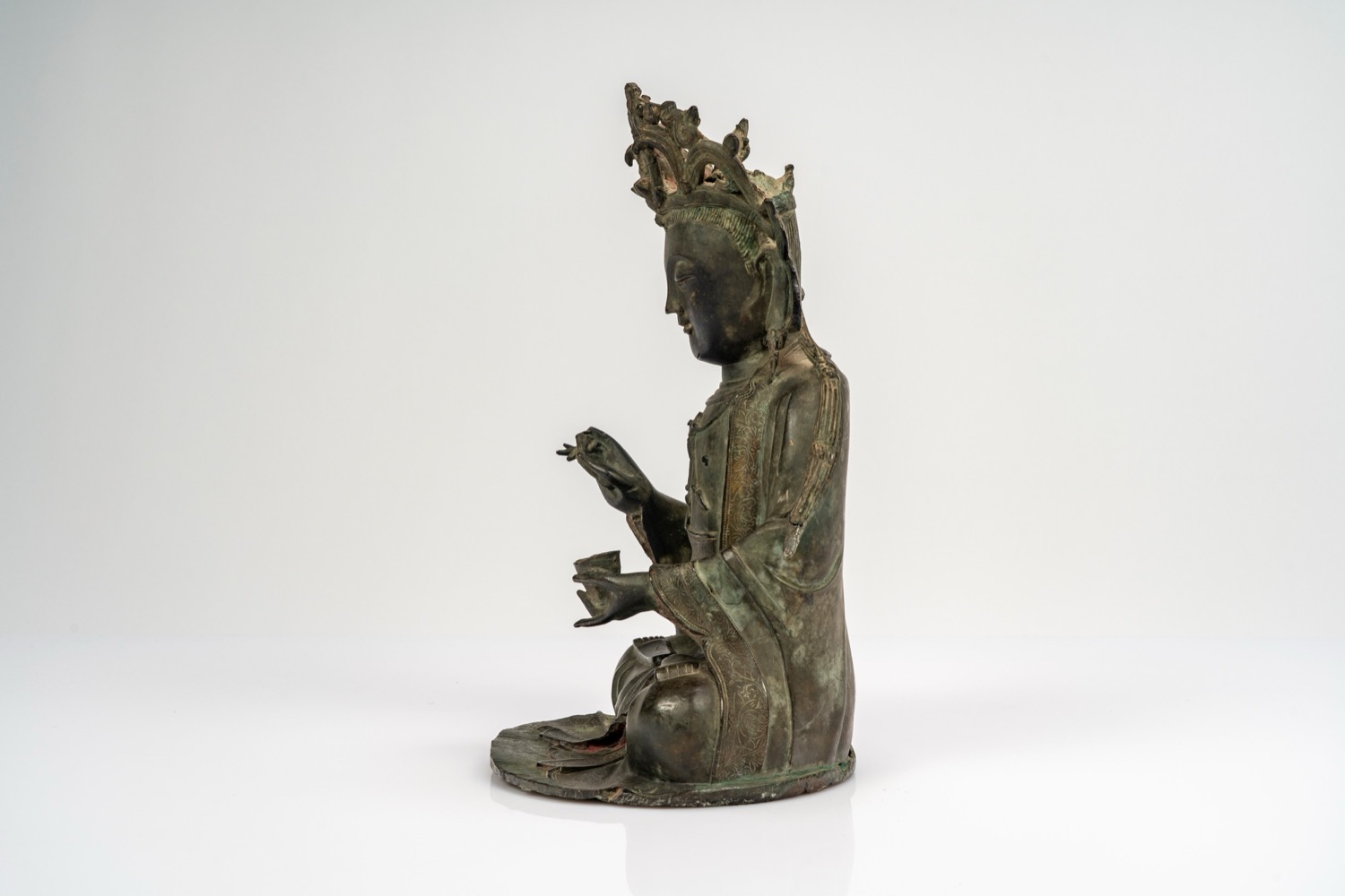 Figura di Guanyin in bronzo a patina scura con tracce di doratura. Cina, dinastia Ming, secolo XVII