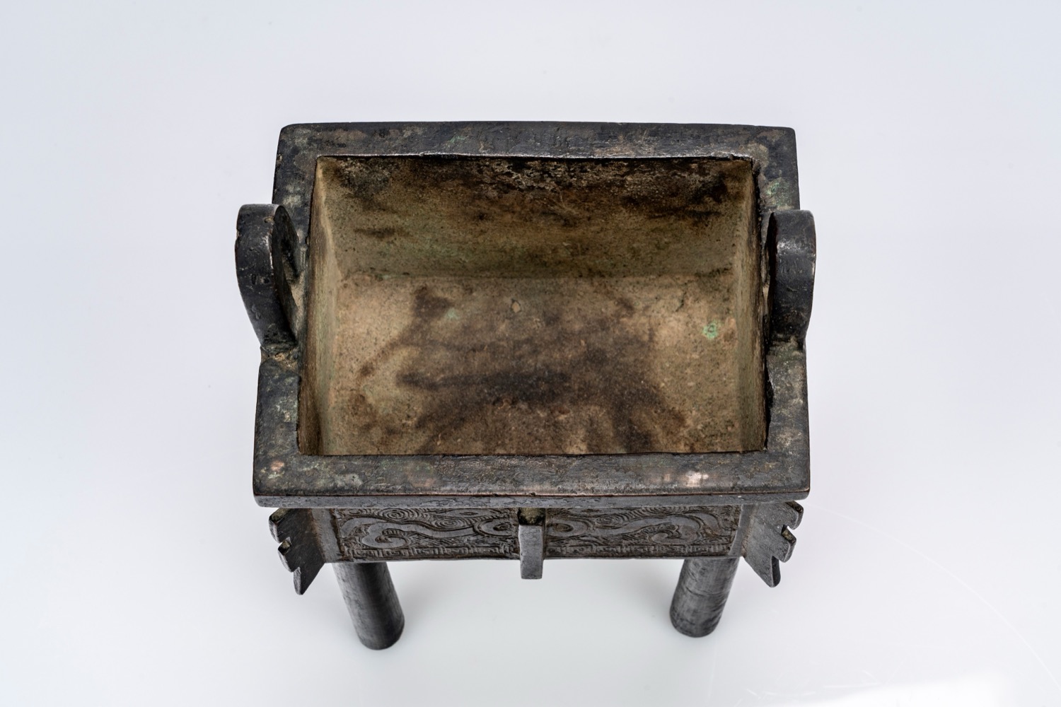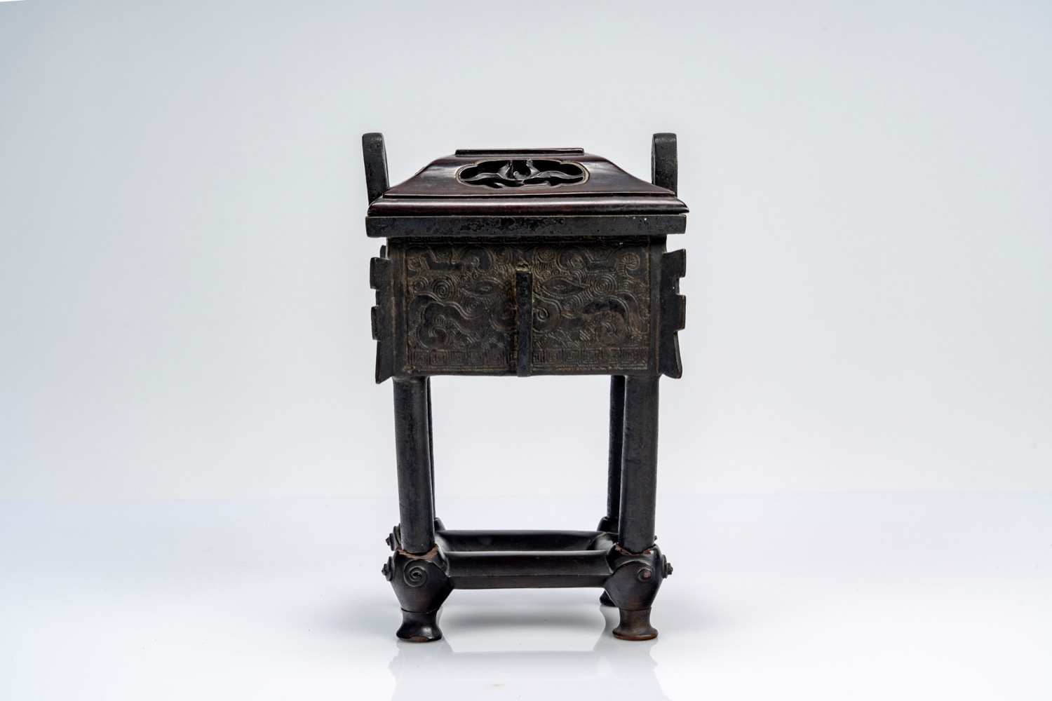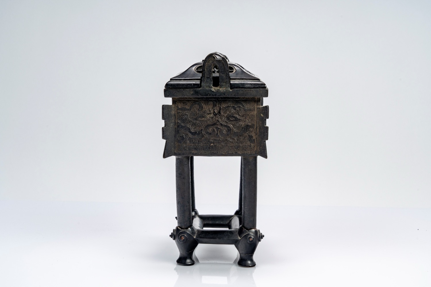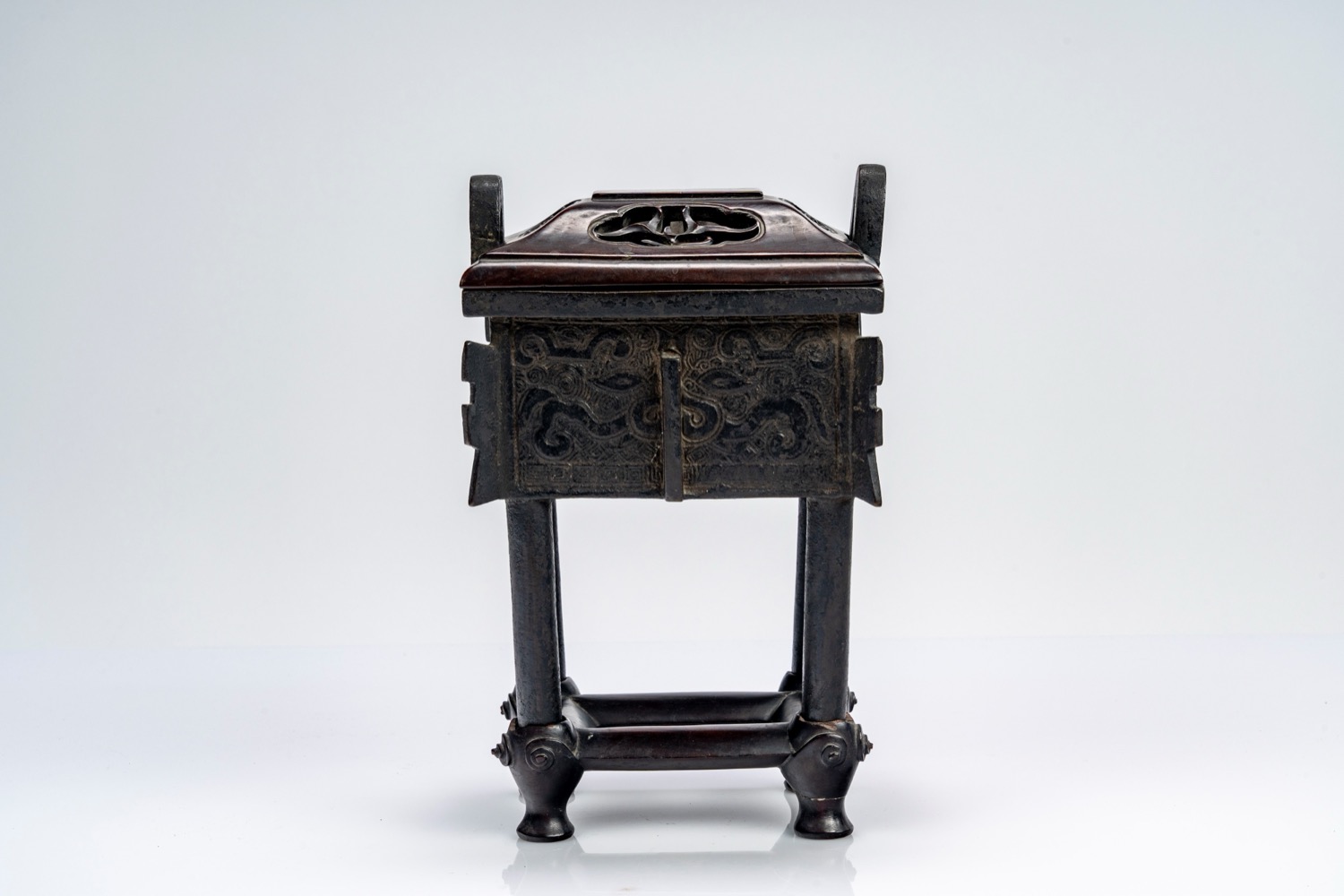 Incensiere in bronzo “fang ding” decorato a motivi taotie, con coperchio e base lignea di epoca successiva. Cina, inizi secolo XIX