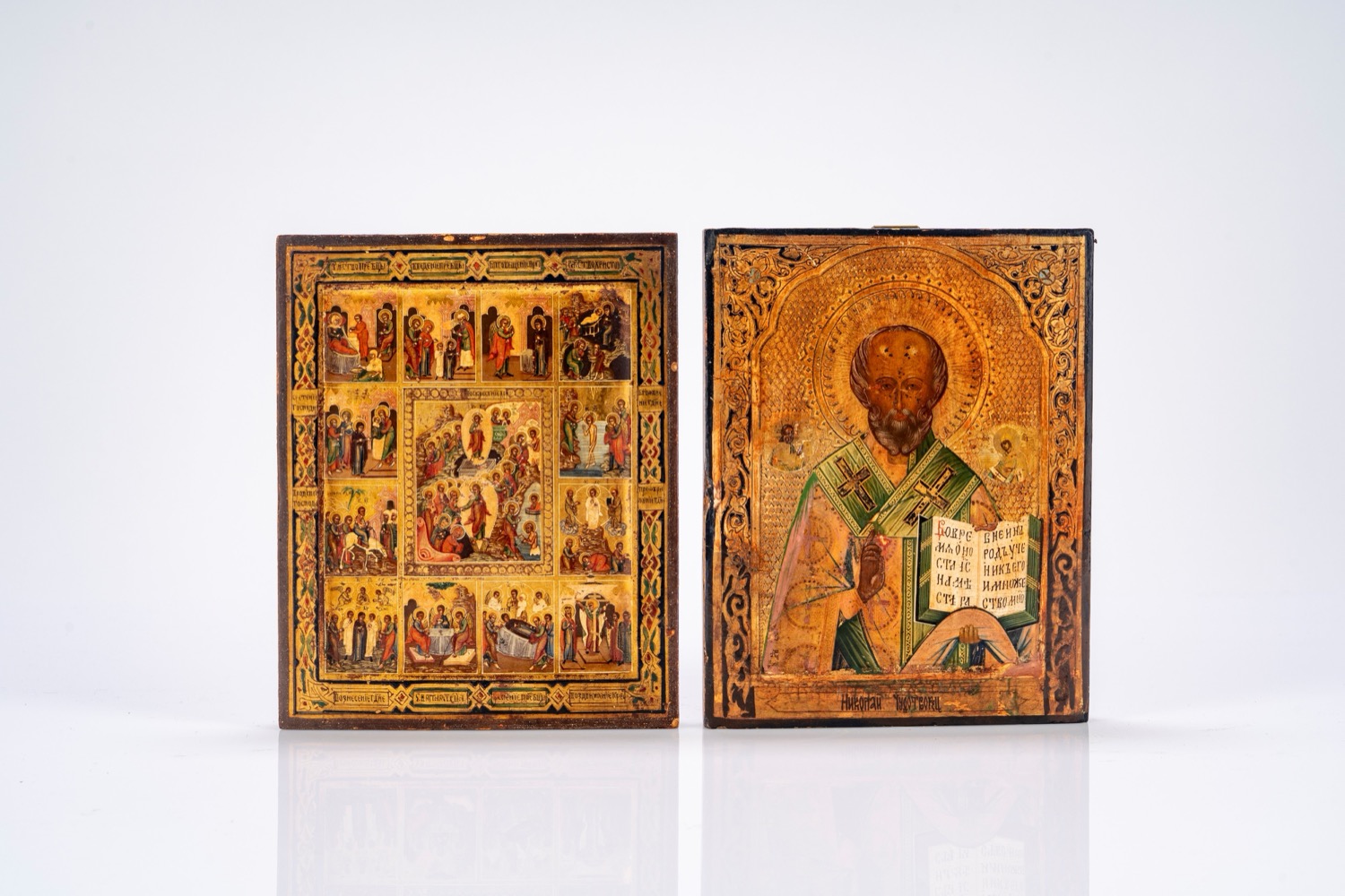 Due icone su tavola raffiguranti la Resurrezione di Cristo con la Discesa agli inferi e le Dodici Feste, e san Nicola di Mira il Taumaturgo. Russia, XIX-XX secolo