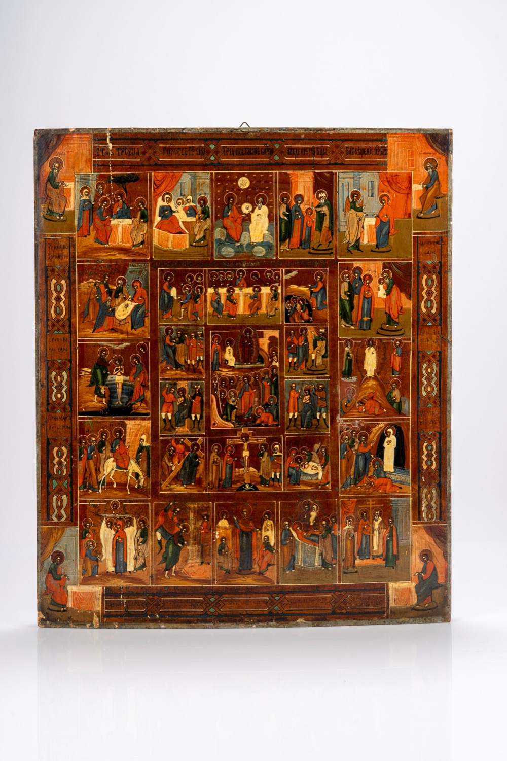 Icona su tavola raffigurante le Sedici Feste con ciclo della Passione. Russia, XIX secolo