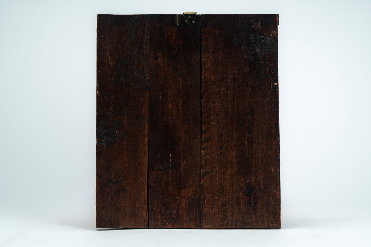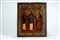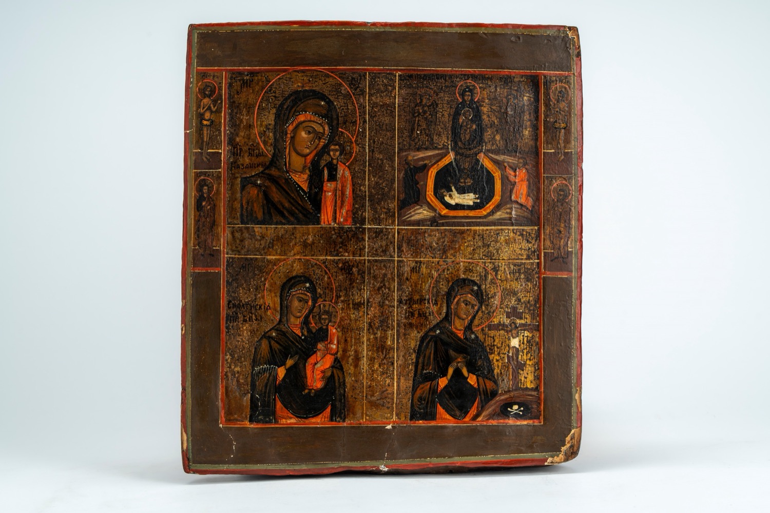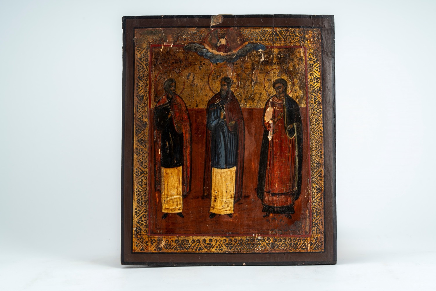 Tre icone su tavola: una raffigurante la Madonna del Roveto Ardente, una mariana quadripartita e una con i tre santi martiri. Russia, fine XIX secolo